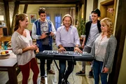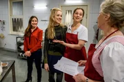 Tinas CousineClara (Jeannine Wacker, l.) platzt mit Ella (Victoria Reich, 2.v.l.) in die Küche und überascht Tina (Christin Balogh, 3.v.l.), die sich gerade mit Hildegard (Antje Hagen, r.) unterhält.Bild: © ARD/Christof Arnold