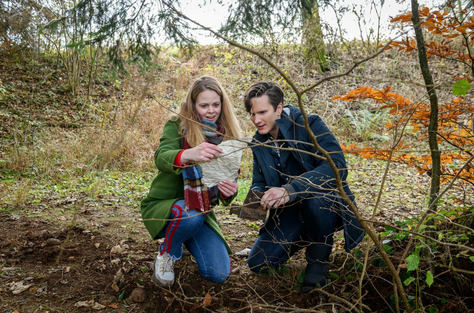 Die SchnitzeljagdLucy (Jennifer Siemann, l.) und Joell (Peter Lewys Preston, r.) finden den zweiten Teil der Schatzkarte.Bild: © ARD/Christof Arnold
