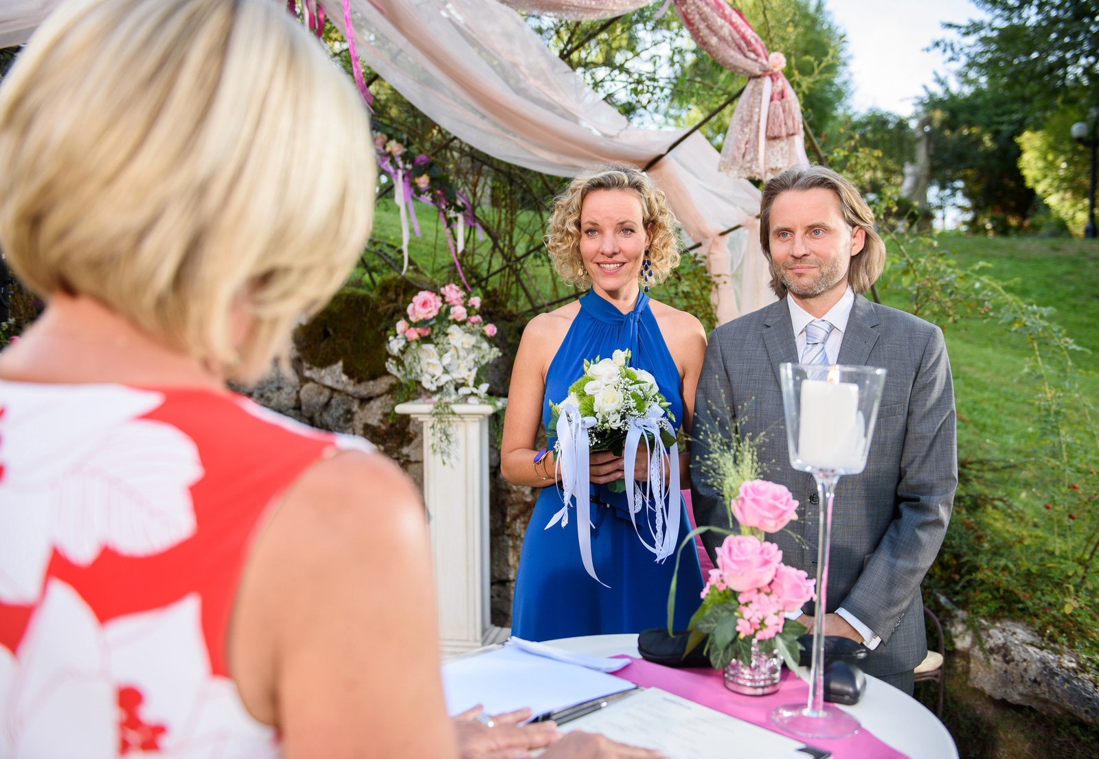 Die BlitzhochzeitNatascha (Melanie Wiegmann, l.) und Michael (Erich Altenkopf, r.) lassen sich in einer intimen und romantischen Zeremonie von Charlotte (Mona Seefried, v.) trauen.Bild: © ORF