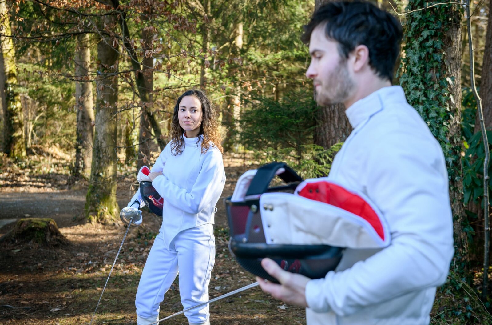 Gefährliche NäheVanessa (Jeannine Gaspár, l.) beeindruckt Georg (Robert Herrmanns, r.) beim Training.Bild: © ARD/Christof Arnold