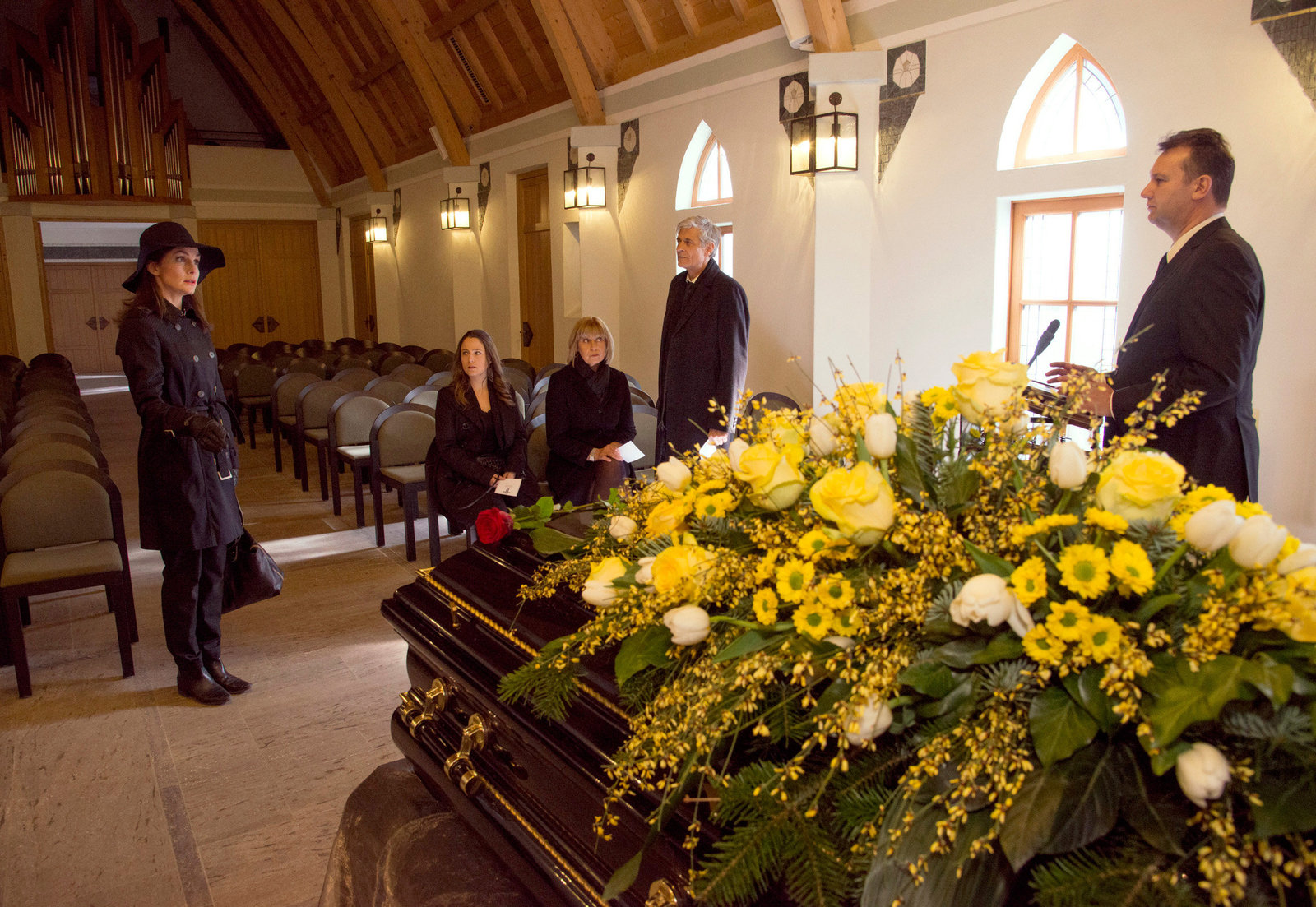 Die TrauerfeierJulia (Jennifer Newrkla, 2.v.li.), Charlotte (Mona Seefried, 3.v.li.) und Friedrich (Dietrich Adam, 2.v.re.) sind entsetzt, als Patrizia (Nadine Warmuth, li.) darauf besteht, den scheinbar toten Niklas nochmal zu sehen.Bild: © ORF