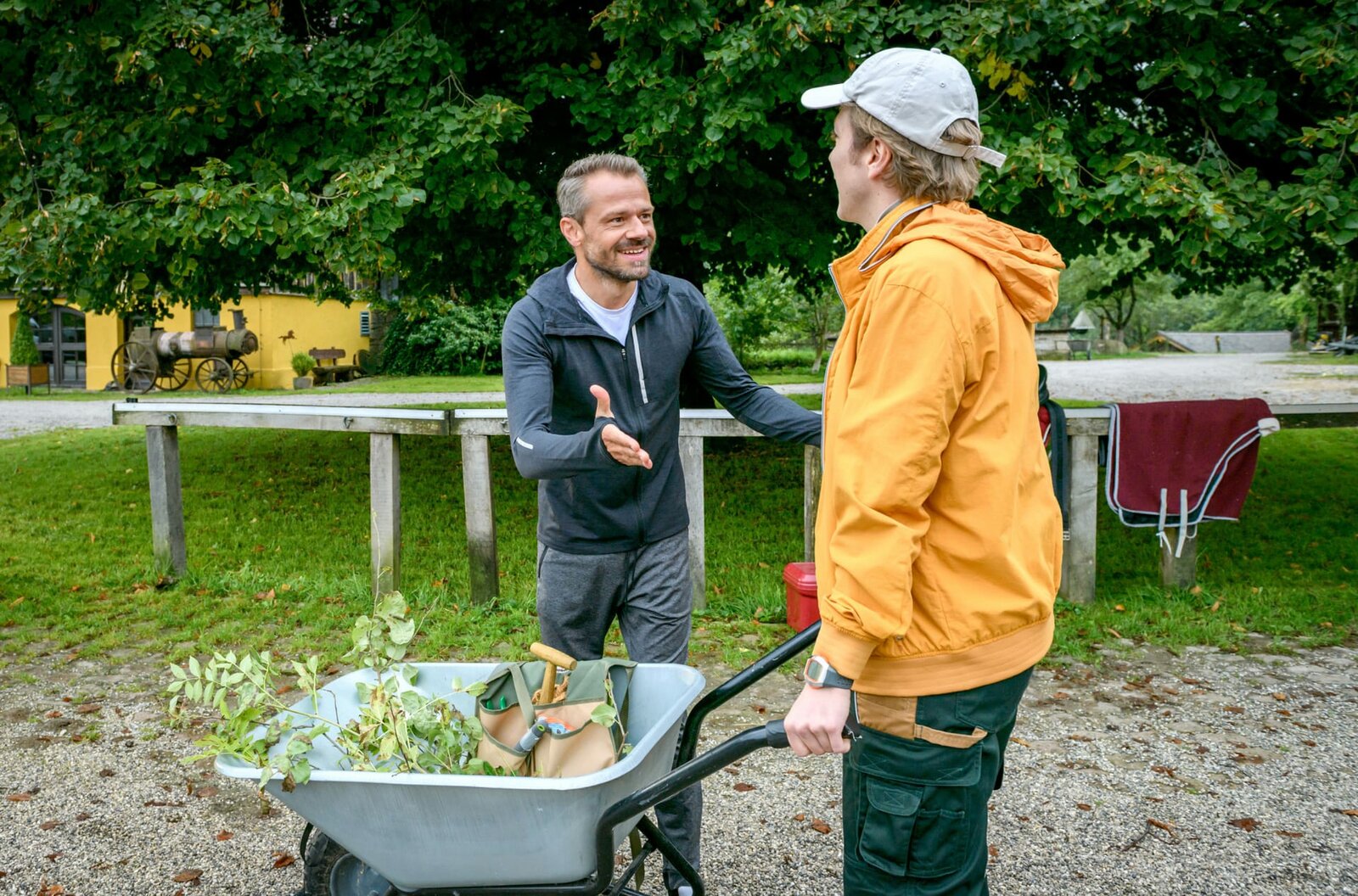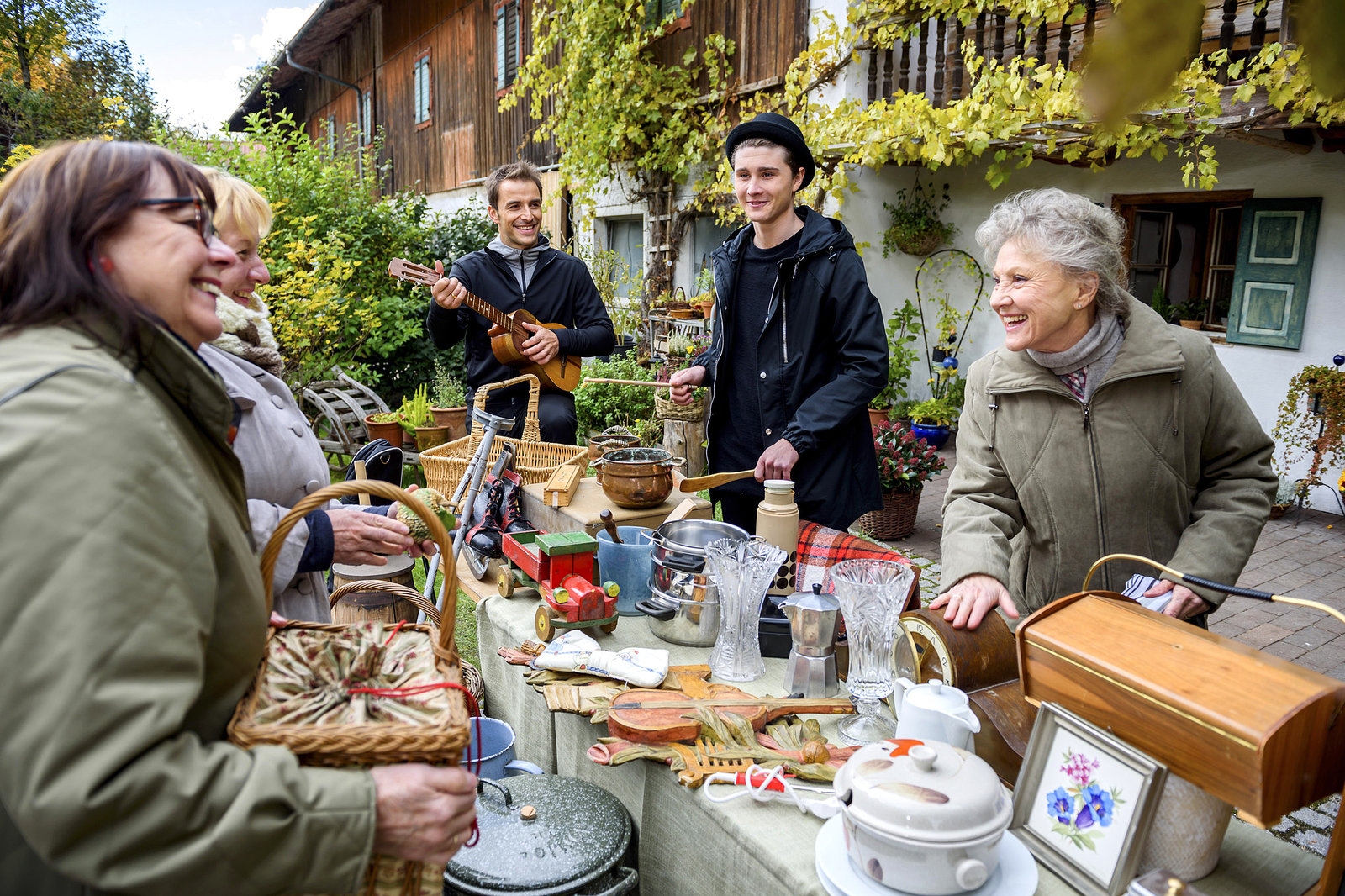 Zwei Väter – zwei MeinungenAdrian (Max Alberti, M.) und Fabien (Lukas Schmidt, 2.v.r.) locken Kunden für Hildegards (Antje Hagen, r.) Flohmarkt an (mit Komparsen, l.).Bild: © ARD/Christof Arnold