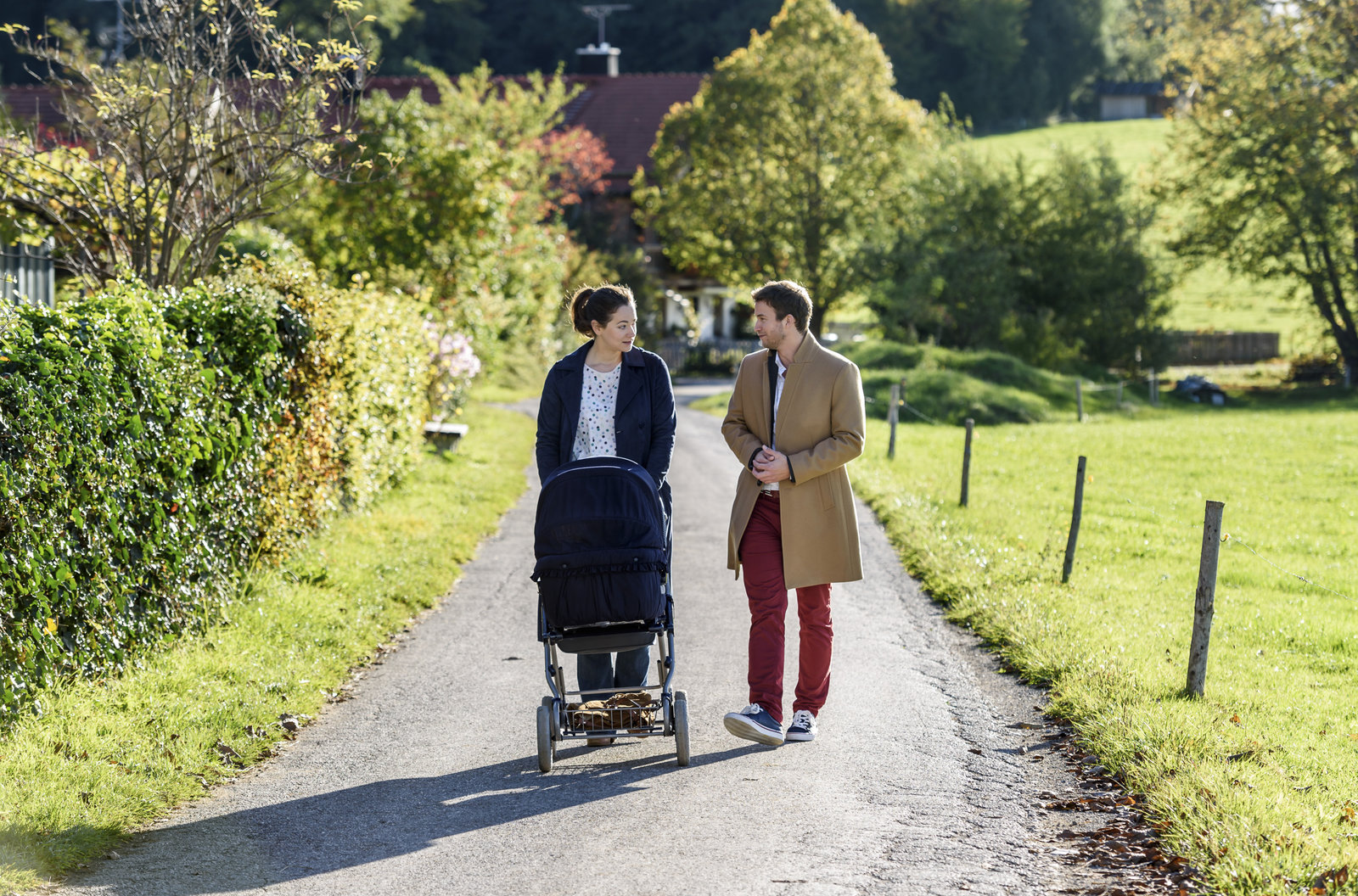 Verdächtiges VerhaltenBoris (Florian Frowein, r.) überzeugt Tina (Christin Balogh, l.), das teurere Auto zu kaufen.Bild: © ARD/Christof Arnold