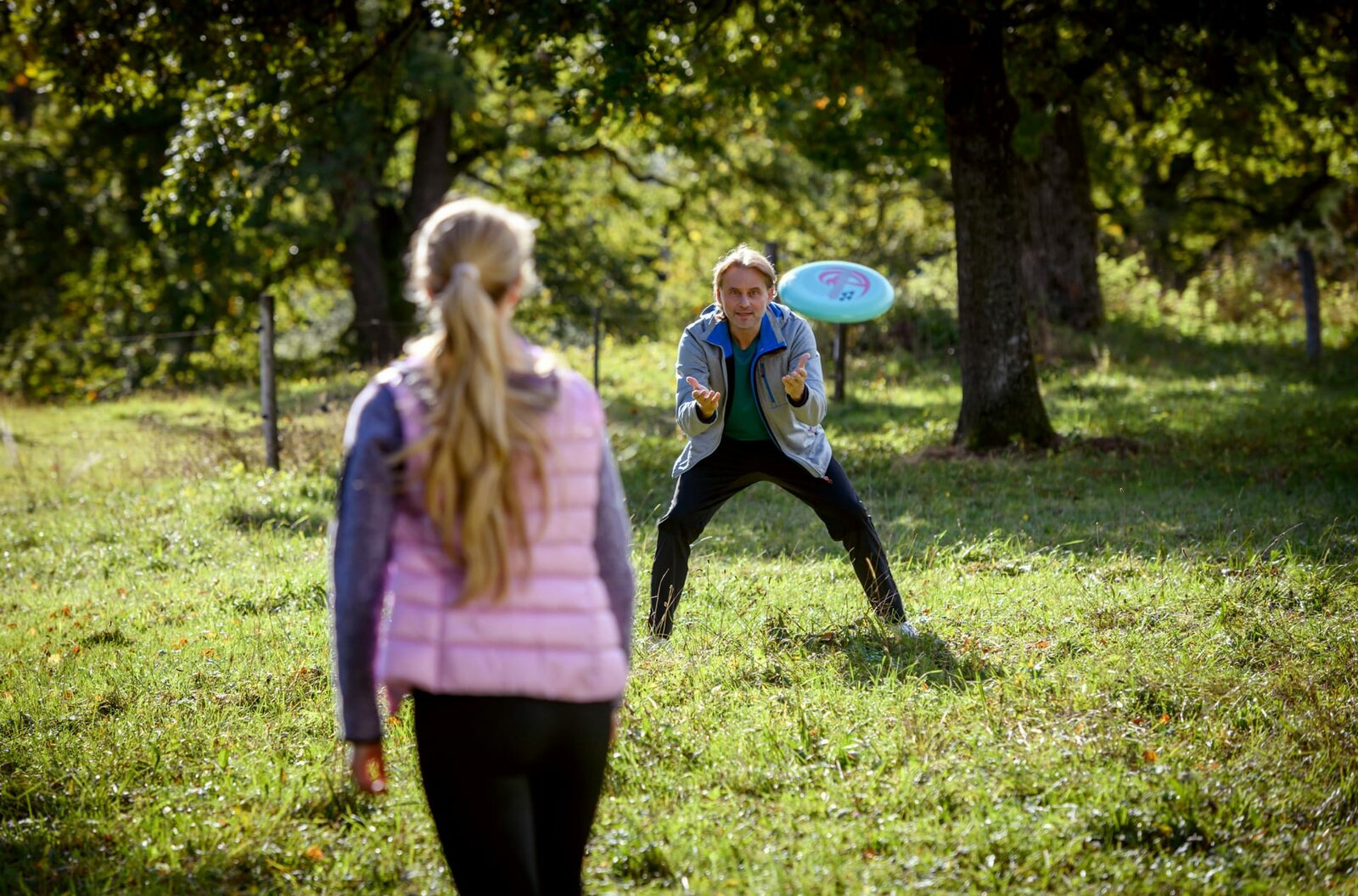 NiederlageMichael (Erich Altenkopf, r.) und Rosalie (Natalie Alison, l.) haben Spaß beim Frisbeespielen.Bild: © ARD/Christof Arnold