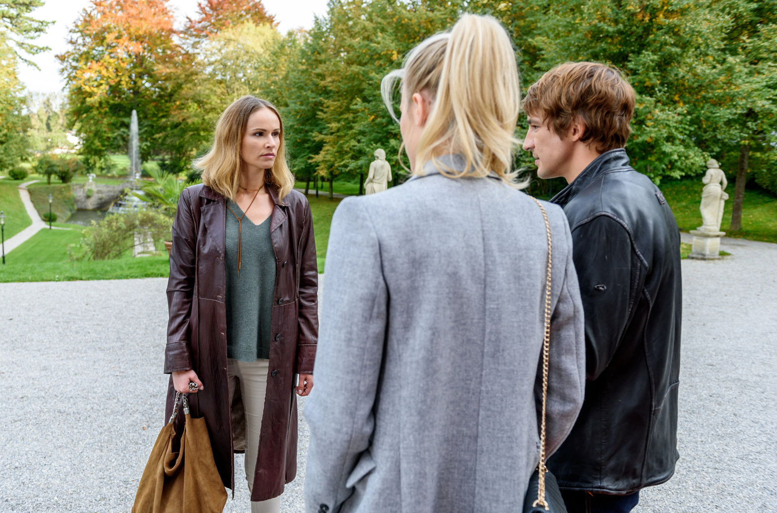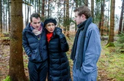 Tinas CousineOskar (Philip Butz, r.) übergibt Beatrice (Isabella Hübner, M.) den wieder erblindeten David (Michael Kühl, l.).Bild: © ORF2