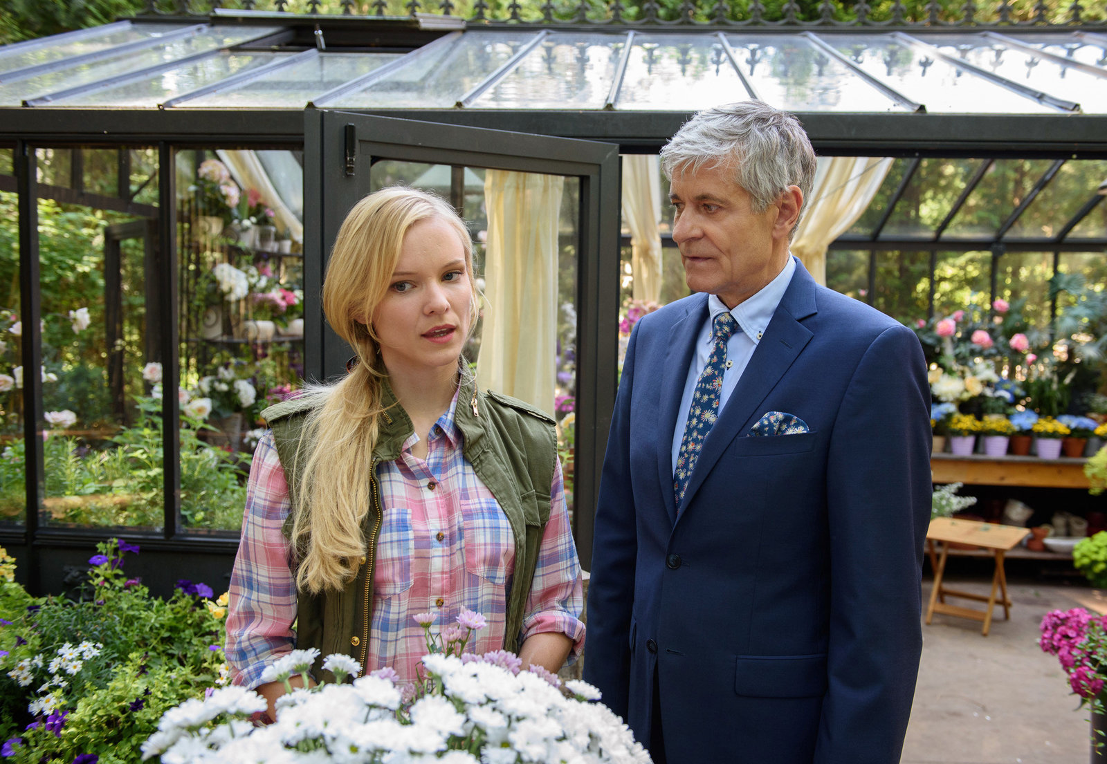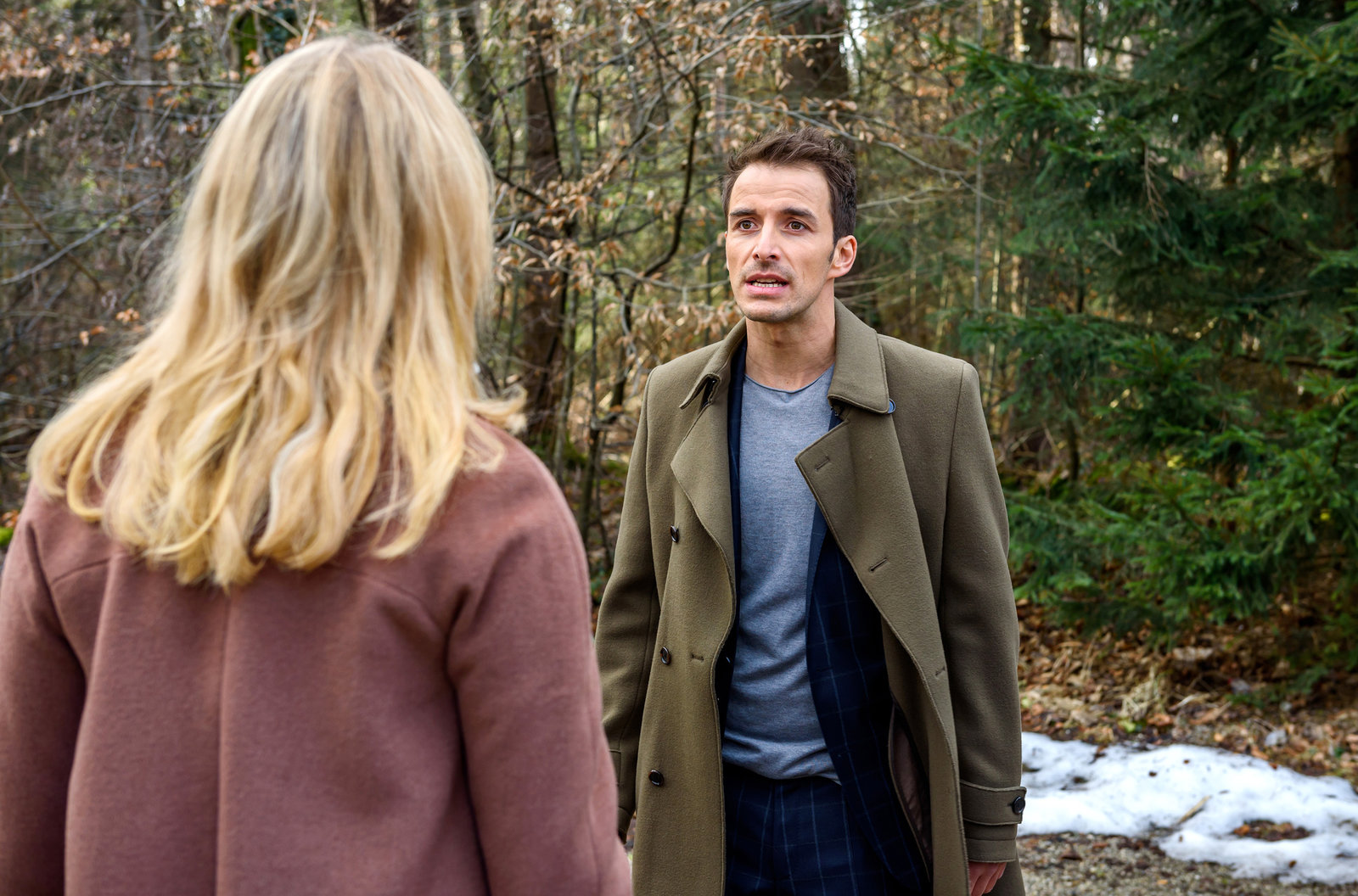 Schlecht gelauntViktor (Sebastian Fischer, r.) ist wegen Alicias (Larissa Marolt, l.) Reiseplänen mit Christoph, schlecht gelaunt.Bild: © ARD/Christof Arnold