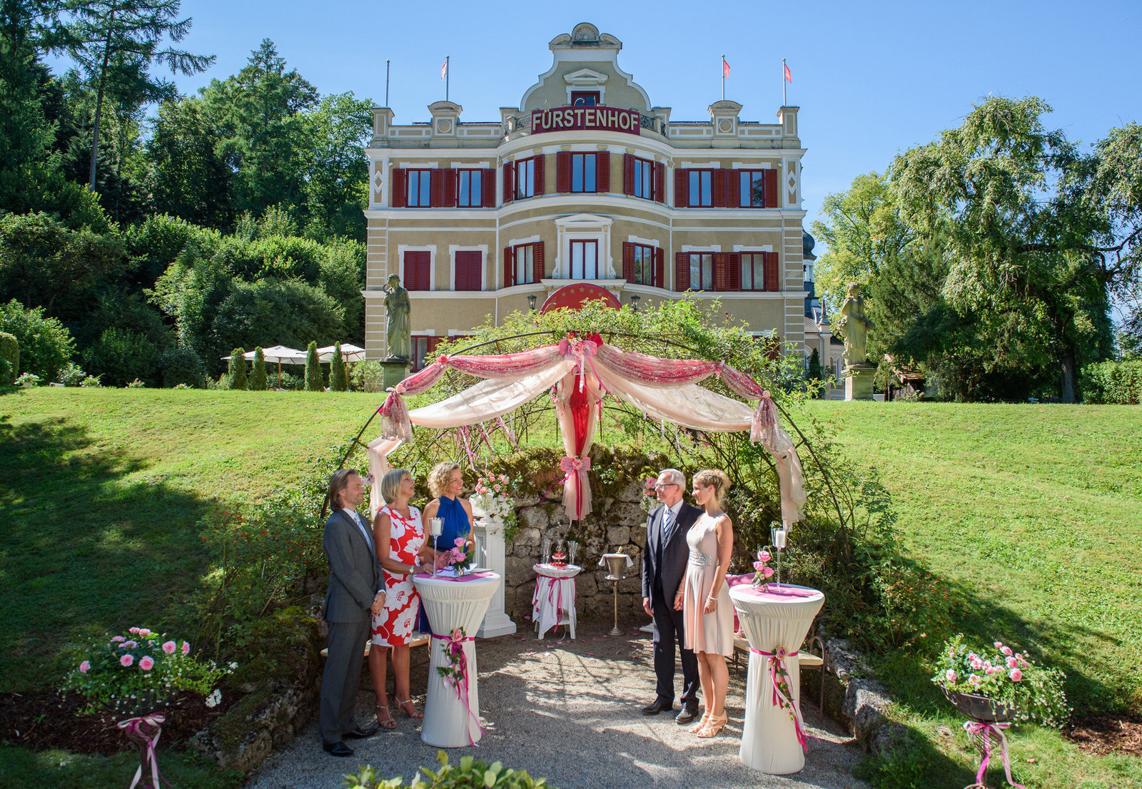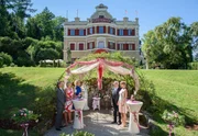 Erneuerung des GelübdesWerner (Dirk Galuba, hinten 2.v.r.) und Poppy (Birte Wentzek, r.) erneuern ihr Eheversprechen vor Michael (Erich Altenkopf, l.), Charlotte (Mona Seefried, 2.v.l.) und Natascha (Melanie Wiegmann, M.).Bild: © ORF