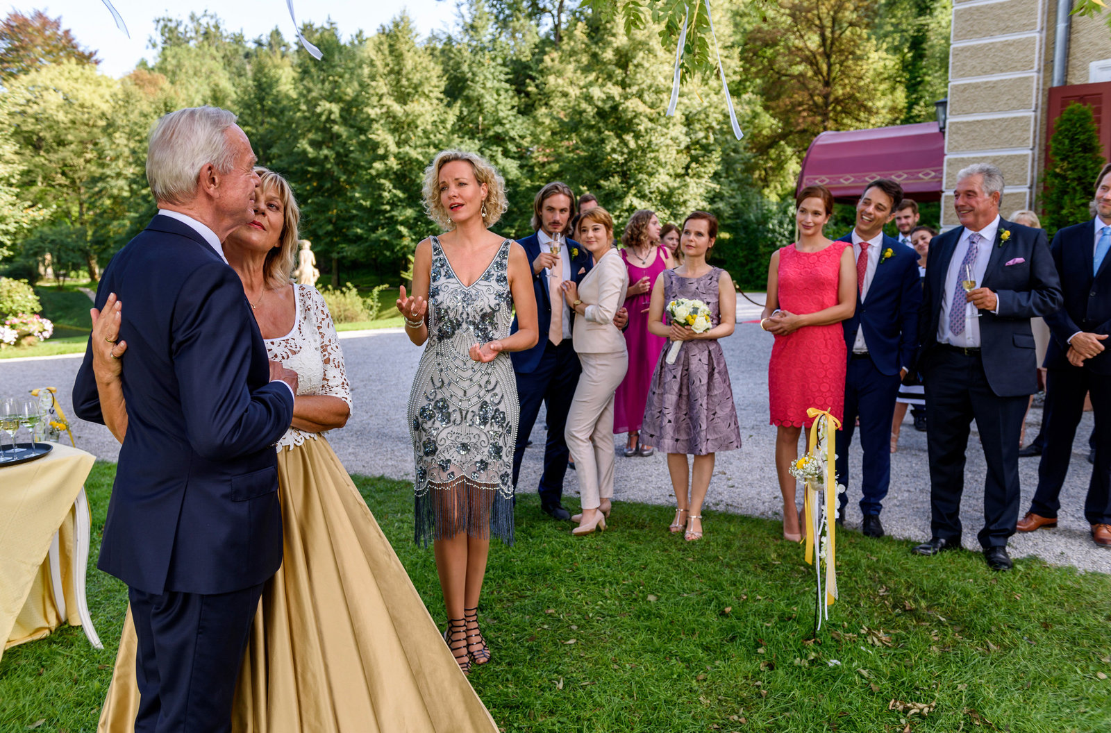 Der große TagNatascha (Melanie Wiegmann, 3.v.l.) singt das Hochzeitslied für Charlotte (Mona Seefried, 2.v.l.) und Werner (Dirk Galuba, l.). Die Gäste (v.l.n.r.: Alexander Milz, Julia Alice Ludwig, Bojana Golenac, Uta Kargel, Lorenzo Patané und Joachim Lätsch) hörgen gerührt zu.Bild: © ORF2