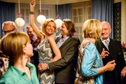 Die ÜberraschungspartyNatascha (Melanie Wiegmann, M.) feiert ihre Heilung mit Michael (Erich Altenkopf, 3.v.r.) und ihren Gästen Charlotte (Mona Seefried, 2.v.r.), Alfons (Sepp Schauer, r.), Melli (Bojana Golenac, l.), Werner (Dirk Galuba, 2.v.l.) und Peter (Michael Sandorov, 3.v.l.).Bild: © mdr