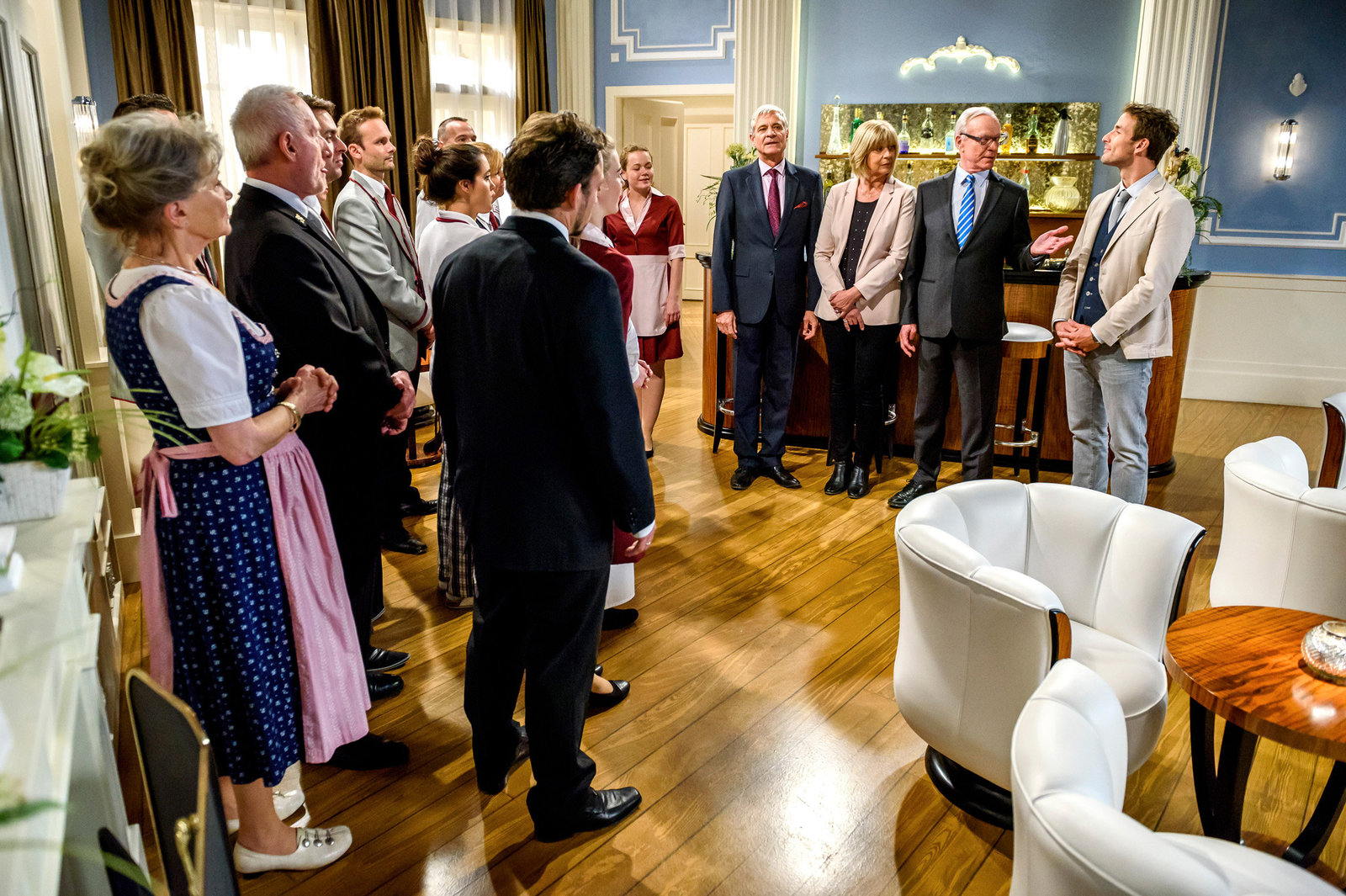 Alte Rechnungen begleichenFriedrich (Dietrich Adam 4.v.r.), Charlotte (Mona Seefried, 3.v.r.) und Werner (Dirk Galuba, 2.v.r.) stellen Alfons (Sepp Schauer, 2.v.l.), Hildegard (Antje Hagen, l.) und dem Rest der Belegschaft (mit Komparsen) den neuen Miteigentümer Adrian Lechner (Max Alberti, r.) vor.Bild: © ORF