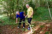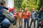 NaturburschenCoach Nico (Patricia Ivanauskas, l.) heißt ihre Waldworkshopgruppe rund um Max (Stefan Hartmann, 2.v.l.), André (Joachim Lätsch, 3.v.l.) und Michael (Erich Altenkopf, 3.v.r.) willkommen (mit Komparsen).Bild: © ARD/Christof Arnold