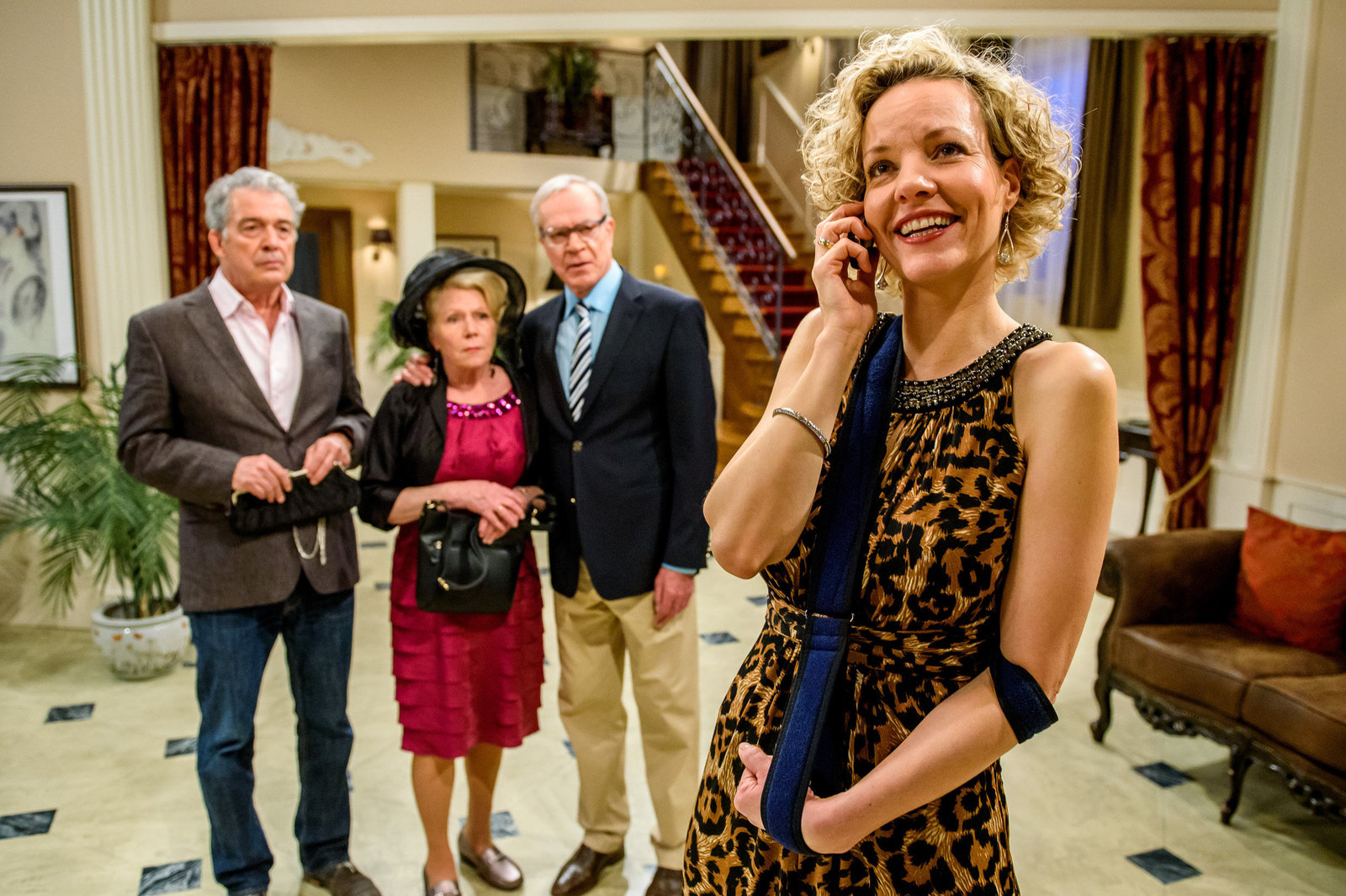 Zu Besuch bei FreundenVanessa (Jeannine Gaspár, r.) verkündet Gerry (Johannes Huth, l.) und Max (Stefan Hartmann, M.), dass der Hollywoodstar Dexter Torrence dem "Fürstenhof" einen Besuch abstatten wird.Bild: © ARD/Christof Arnold / ARD-Programmdirektion