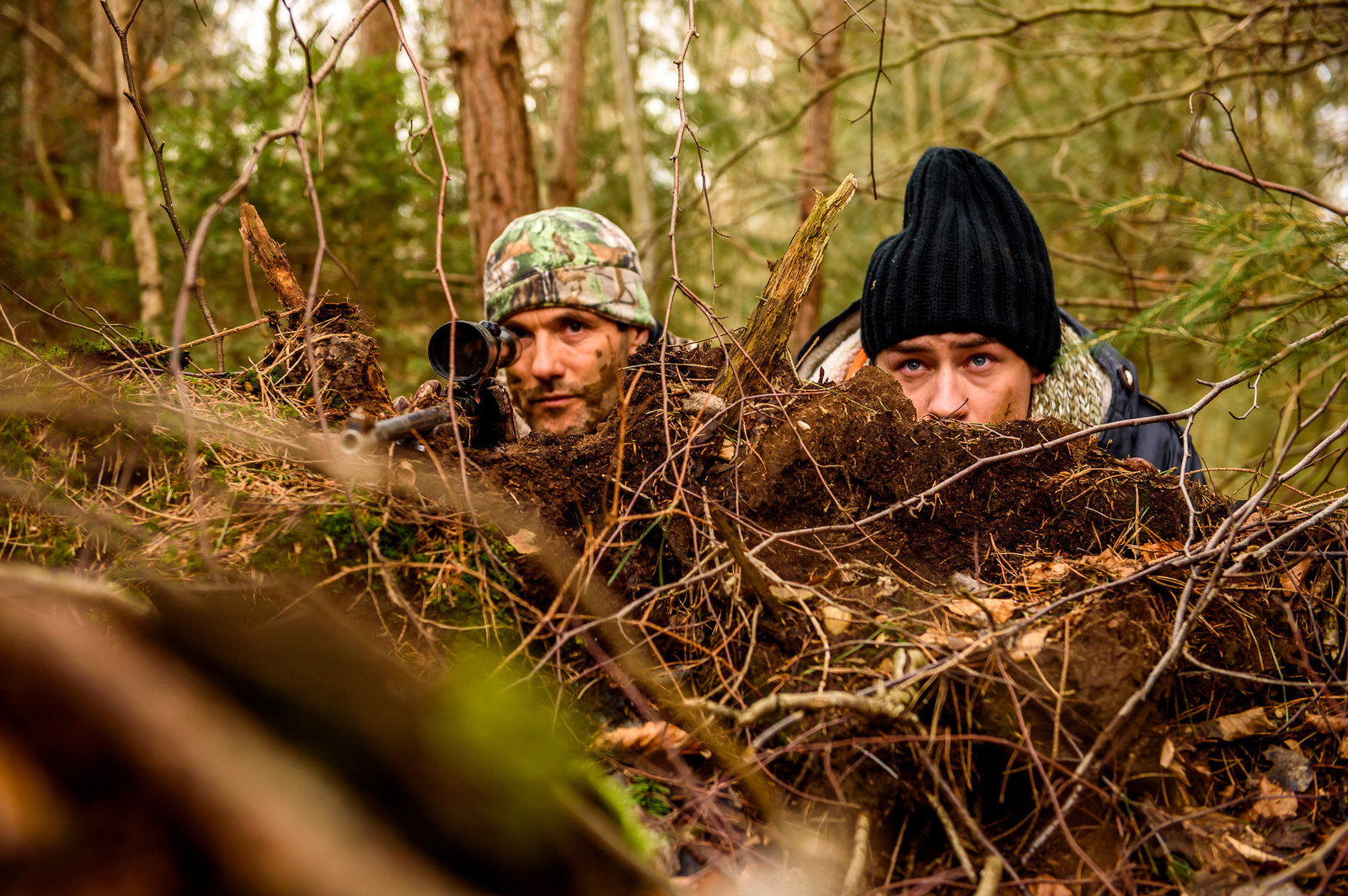 Hollywood am FürstenhofDer Jagdausflug mit dem Actionfilm-Darsteller Dexter Torrence (Andreas Beckett, l.) treibt Norman (Niklas Löffler, r.) an seine Grenzen.Bild: © ORF