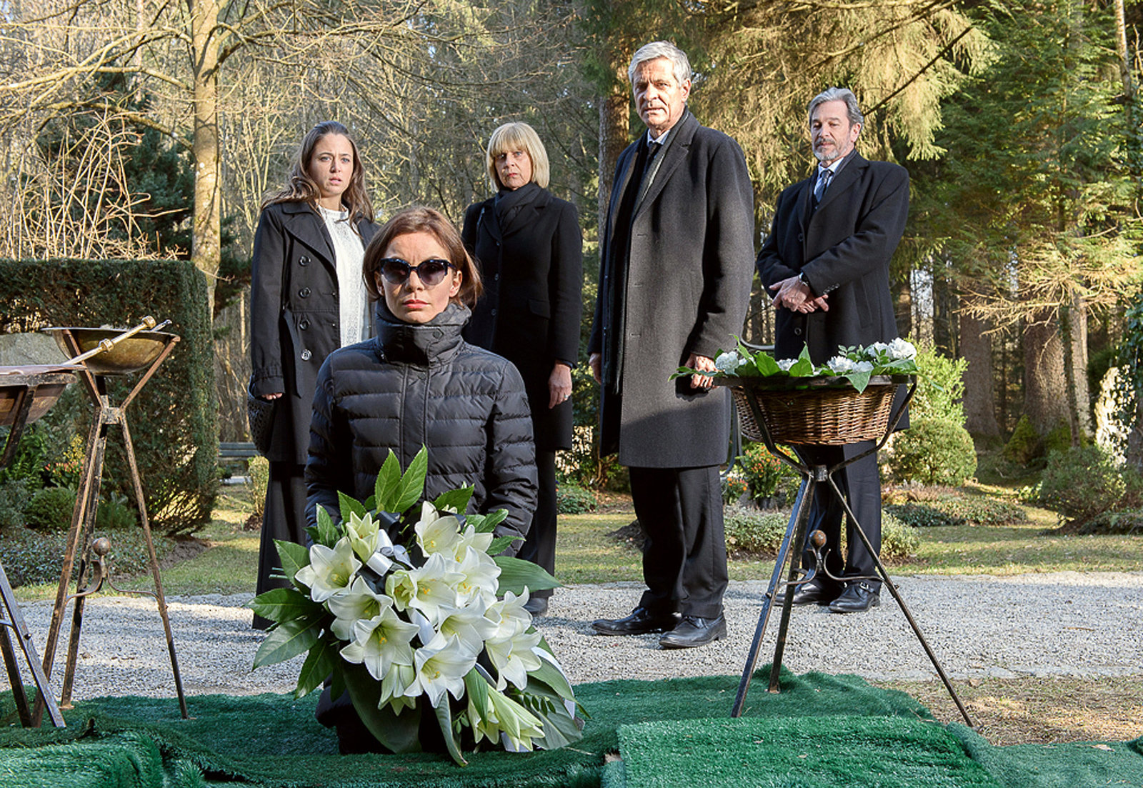 Sophias BeerdigungSophies Leichnam wird beerdigt: Julia (Jennifer Newrkla, li.), Charlotte (Mona Seefried, 3.v.li.) und Friedrich (Dietrich Adam, 2.v.re.) stockt der Atem, als Patrizia (Nadine Warmuth, 2.v.li.) Blumen am Grab von Sophie niederlegt. Auch Hermann Stürzebecher (Günter Barton, re.) ist zur Beerdigung gekommen um seinem Freund Friedrich bei dessen Trauer beizustehen.Bild: © ORF