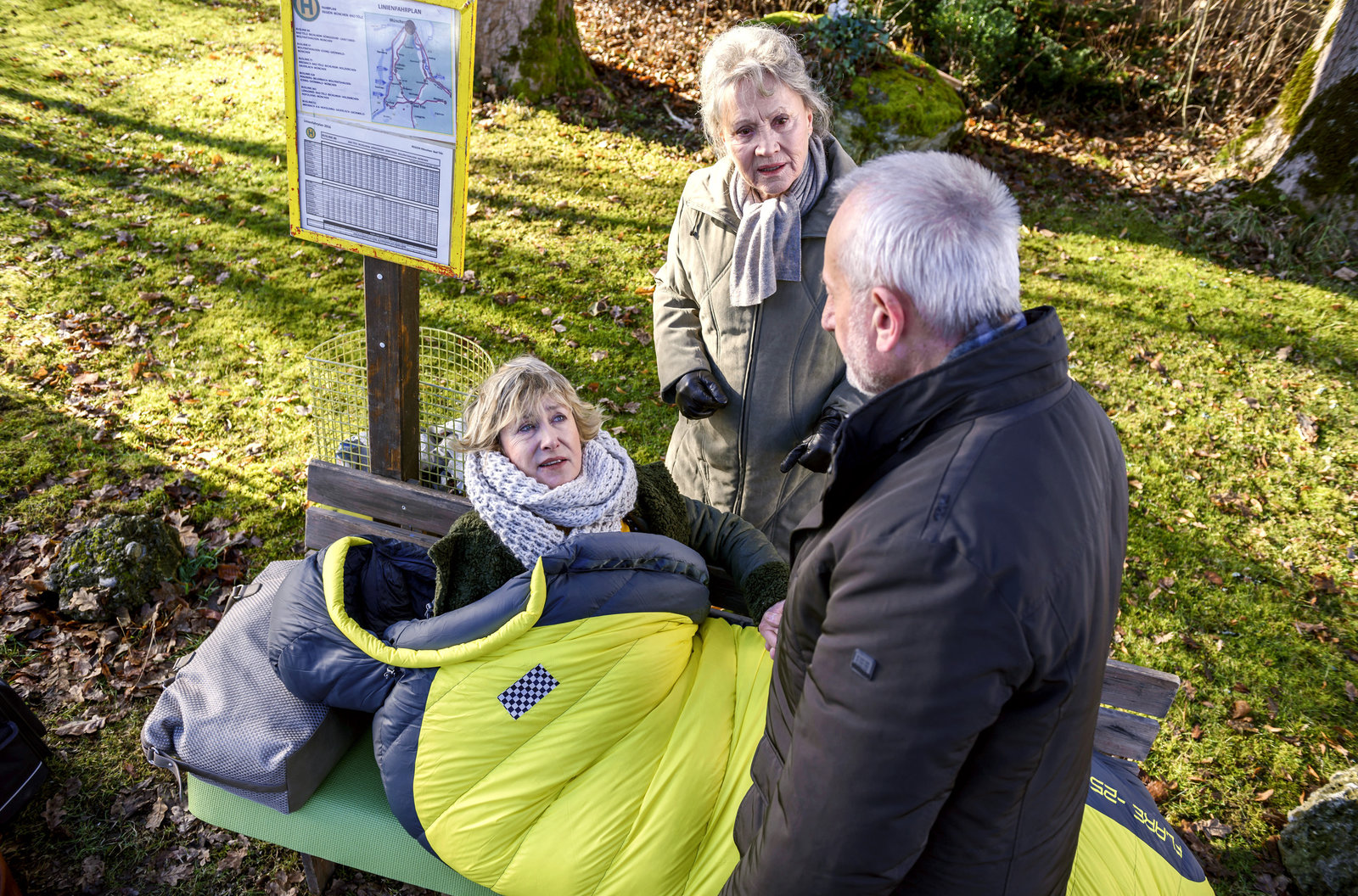 VerliebtHildegard (Antje Hagen, M.) und Alfons (Sepp Schauer r.) finden Gerti (Beatrice Richter, l.) schlafend auf einer Bank.Bild: © ARD/Christof Arnold