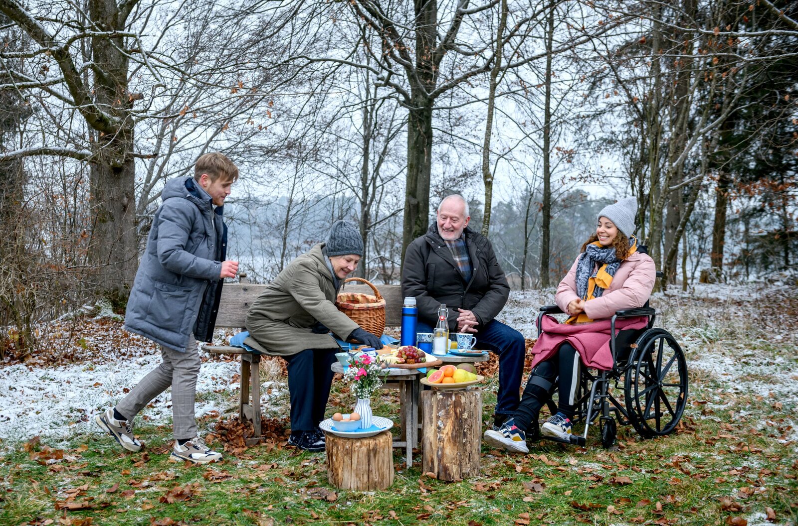 Eine AusspracheAlfons (Sepp Schauer, 2.v.l.) und Hildegard (2.v.l.) platzen in die Zweisamkeit von Max (Stefan Hartmann, l.) und Vanessa (Jeannine Gaspár, r.).Bild: © ARD/Christof Arnold