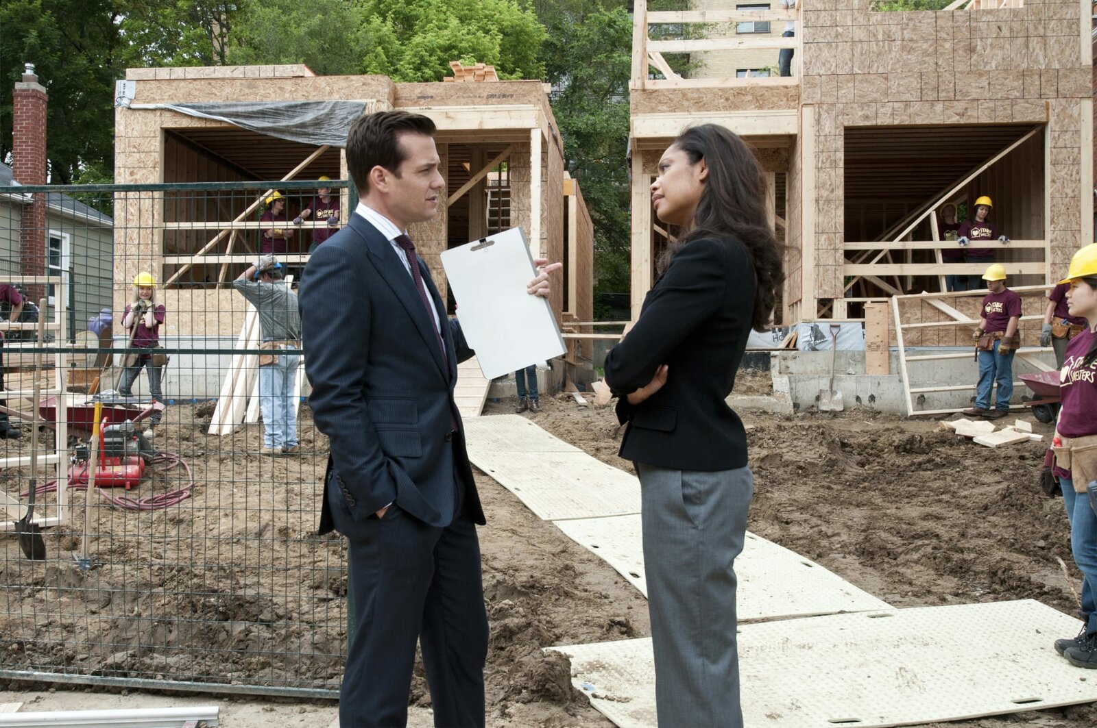 SchlammschlachtSUITS -- "Good Mudding" Episode 805 -- Pictured: (l-r) Sarah Rafferty as Donna Paulsen, Rick Hoffman as Louis Litt -- (Photo by: Shane Mahood)Bild: © 2017 Open 4 Business Productions LLC / UNIVERSAL TV/USA Network/USA Network