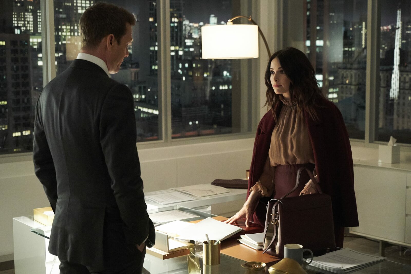 GefangenendilemmaSUITS -- "Prisoner's Dilemma" Episode 908 -- Pictured: (l-r) Gabriel Macht as Harvey Specter, Sarah Rafferty as Donna Paulsen -- (Photo by: Pana Pantazidis/USA Network)Bild: © UTV / 2019 Open 4 Business Productions, LLC/USA Network/USA Network