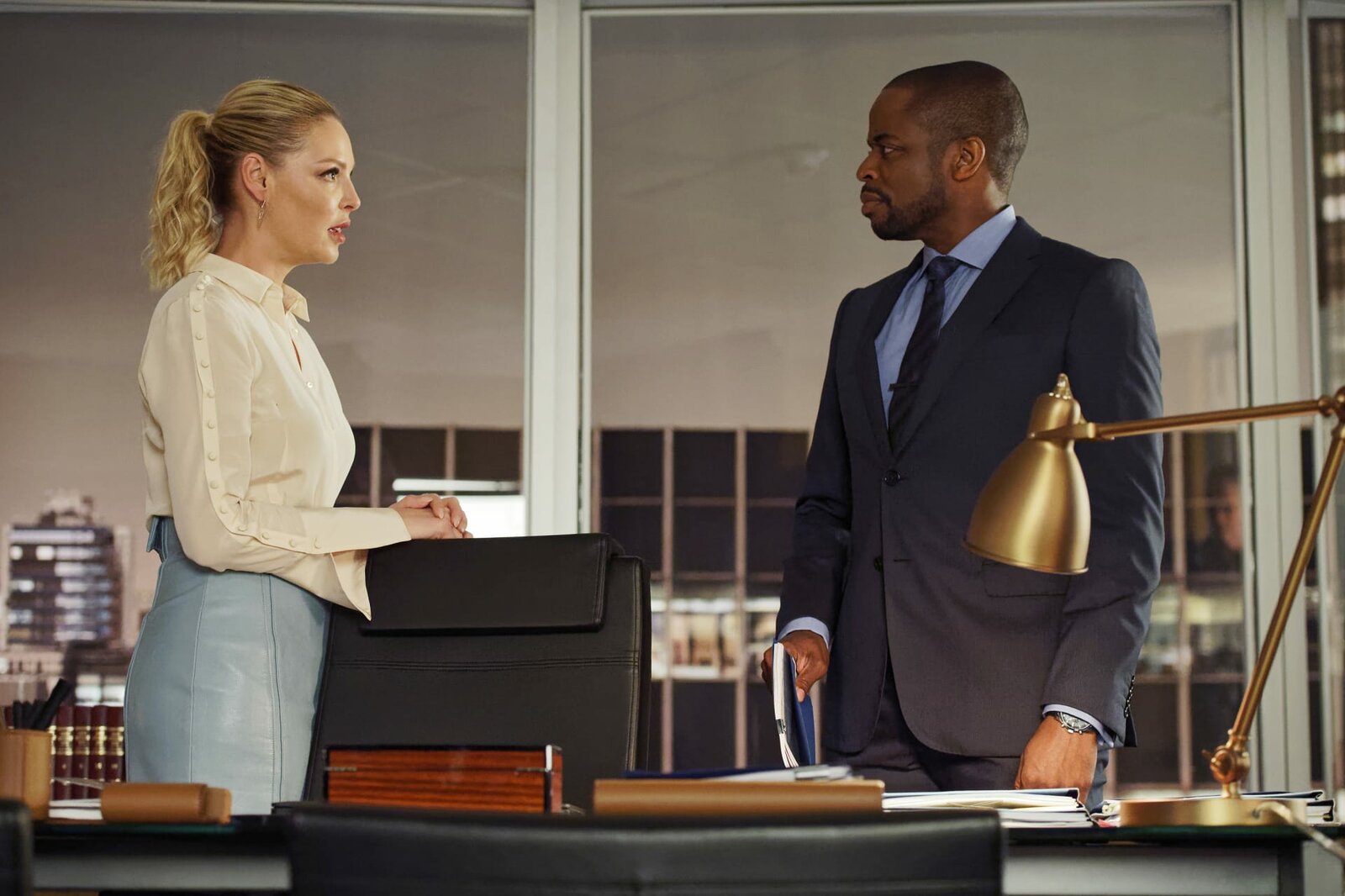 WalfangSUITS -- "Whale Hunt" Episode 812 -- Pictured: (l-r) Katherine Heigl as Samantha Wheeler, Dule Hill as Alex -- (Photo by: Ben Mark Holzberg/USA Network)Ben Mark Holzberg benmark.caBild: © 2017 Open 4 Business Productions LLC / UNIVERSAL TV/USA Network/USA Network