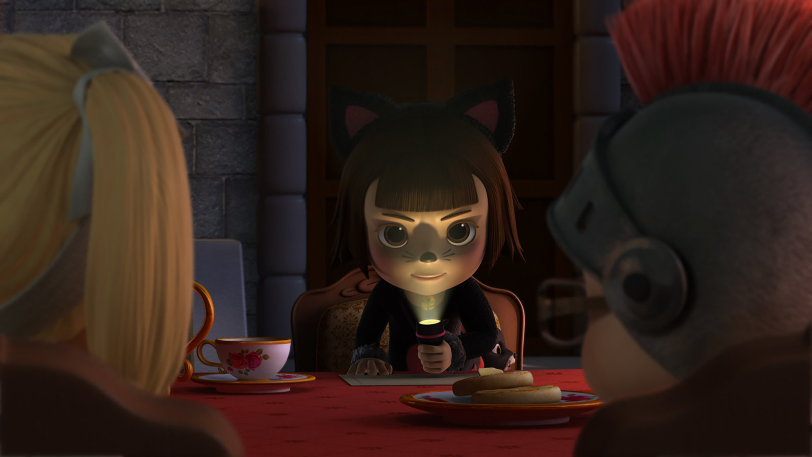 Fliegende RiesentorteBrigita erzählt ihren Freunden Gruselgeschichten.Bild: © KiKA/FunnyFlux/QianQi/EBS/CJ E&M