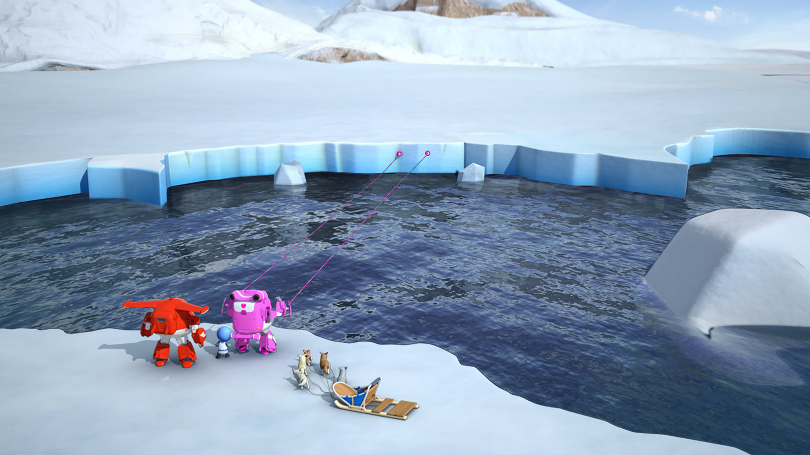 SchlittenhunderennenDizzy muss Jett und Enok helfen wieder auf das Festland zu gelangen.Bild: © KiKA/FunnyFlux/QianQi/EBS/CJ E&M