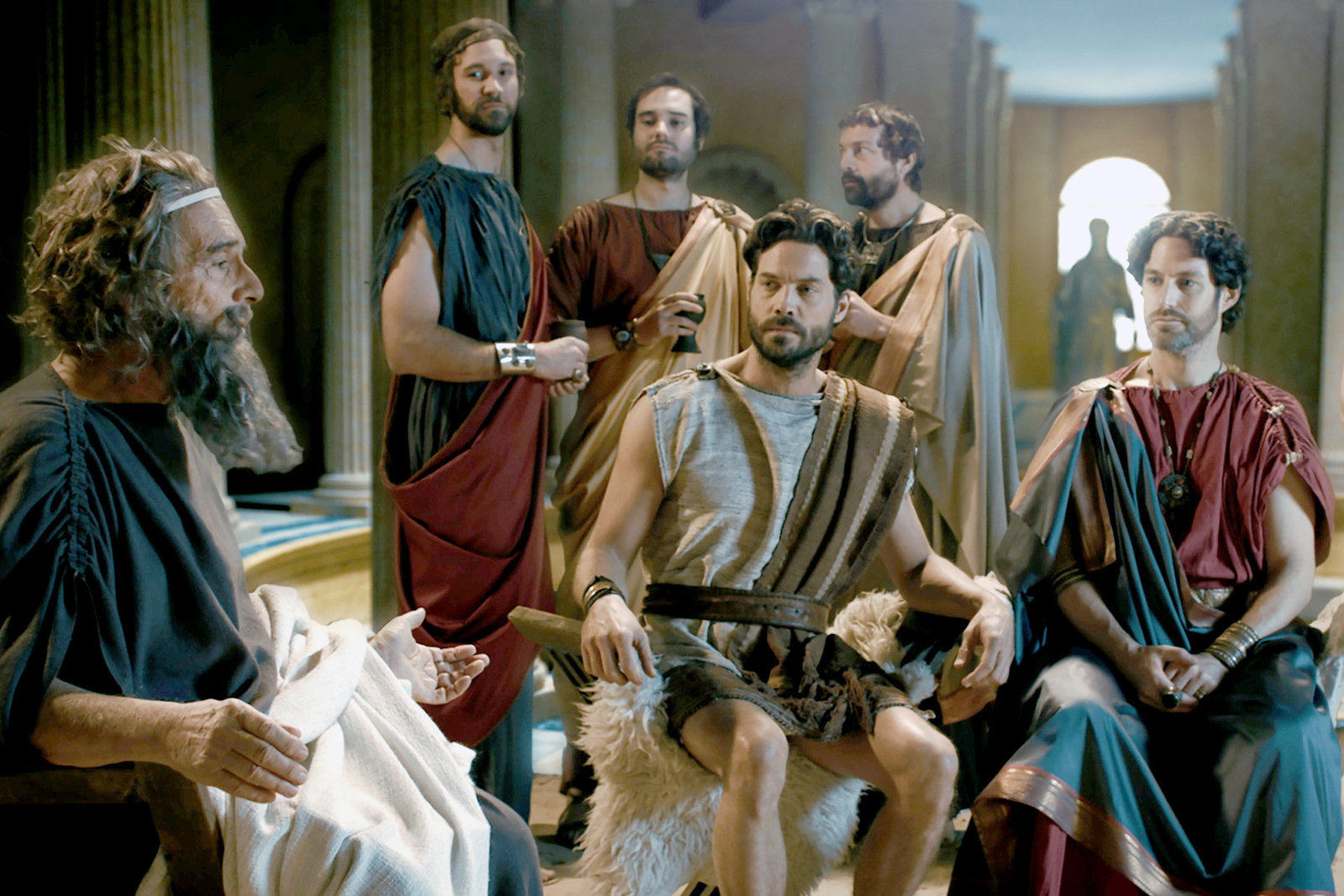 OdysseusOdysseus (Stephan Käfer, vorne Mi.) hört beim König der Phäaken dem Vortrag eines blinden Dichters (Manos Papadopoulos, li.) zu.Bild: © ZDF / © Holger Neuhäuser