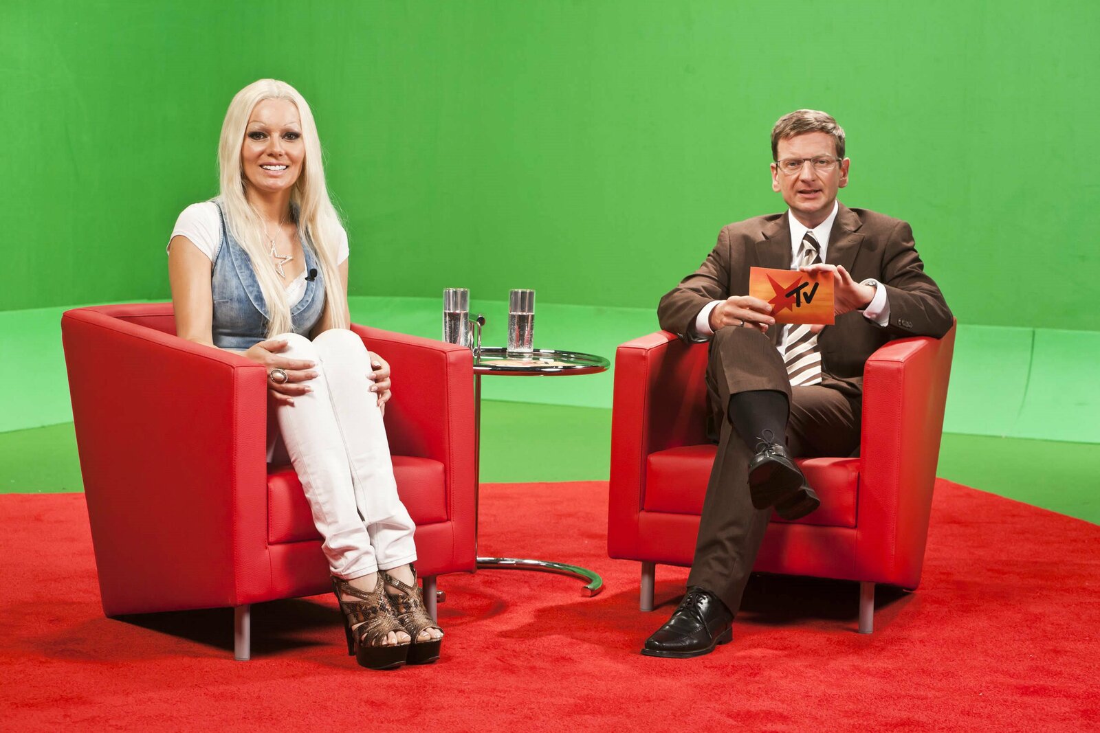 Daniela Katzenberger (Martina Hill, l.) ist zu Gast. Günther Jauch (Michael Kessler, r.) klärt auf warum ganze Medienzweige am Tropf der Blondine hängen.Bild: © ProSieben / Kai Schulz Eigenproduktionsbild frei