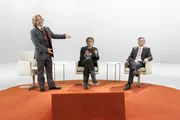 Thomas Gottschalk (Bernhard Hoëcker, l.) begrüßt seine Gäste Günter Jauch (Michael Kessler, r.) und Renate Künast (Martina Hill, M.) im Studio ...Bild: © ProSieben / Kai Schulz Eigenproduktionsbild frei