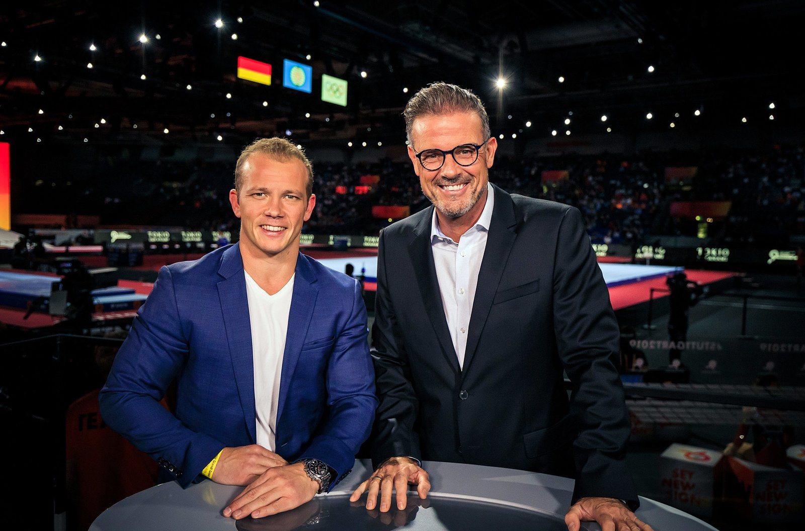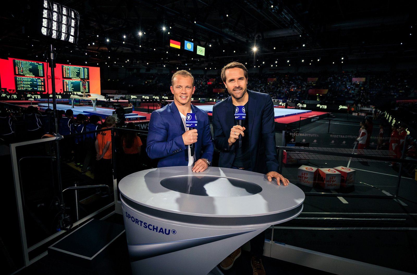 SÜDWESTRUNDFUNK SWR Sport - Die Turn-WM wird durch umfangreiche Berichterstattung im Ersten, im SWR Fernsehen sowie bei Sportschau.de und unter SWR.de/sport begleitet. ARD-Kommentator Philipp Sohmer (SWR) und Deutschlands bekanntester Turner, ARD Experte Fabian Hambüchen bei der Turn-Weltmeisterschaft 2019 in Stuttgart. © SWR/Yannick Bodemer Fotografie, honorarfrei - Verwendung gemäß der AGB im engen inhaltlichen, redaktionellen Zusammenhang mit genannter SWR-Sendung bei Nennung "Bild: SWR/Yannick Bodemer Fotografie" (S2+). SWR Presse/Bildkommunikation, Baden-Baden, Tel: 07221/929-222202, foto@swr.deBild: © SWR/Yannick Bodemer Fotografie / SWR Presse/Bildkommunikation