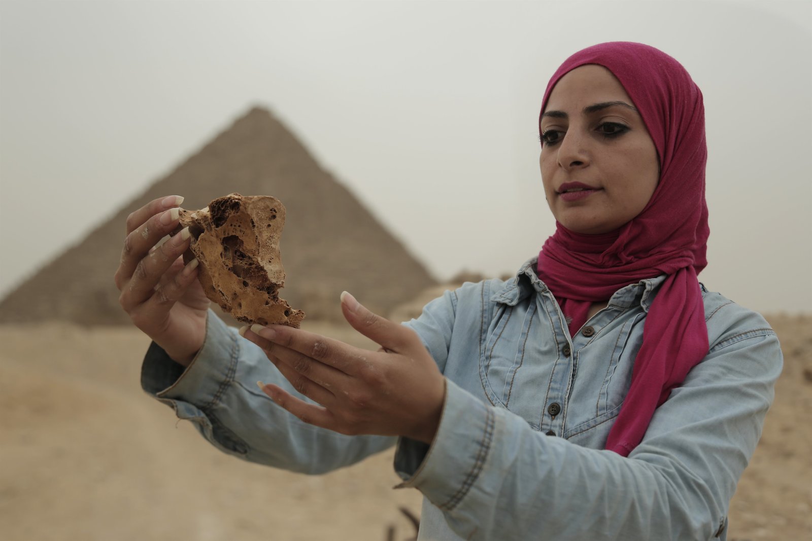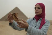 Suche nach der verschollenen GrabkammerCairo, Egypt - Sara in front of the pyramids, looking at a bone fragment found from within the tomb.Bild: © Windfall Films