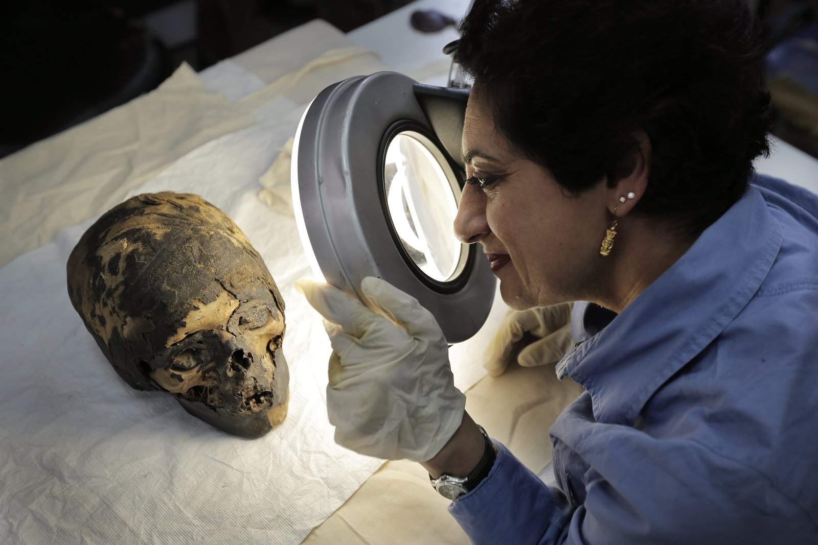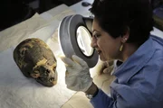 GrabräuberCairo Museum, Egypt - Salima Ikram looking through magnifying glass at a skull.Bild: © Windfall Films