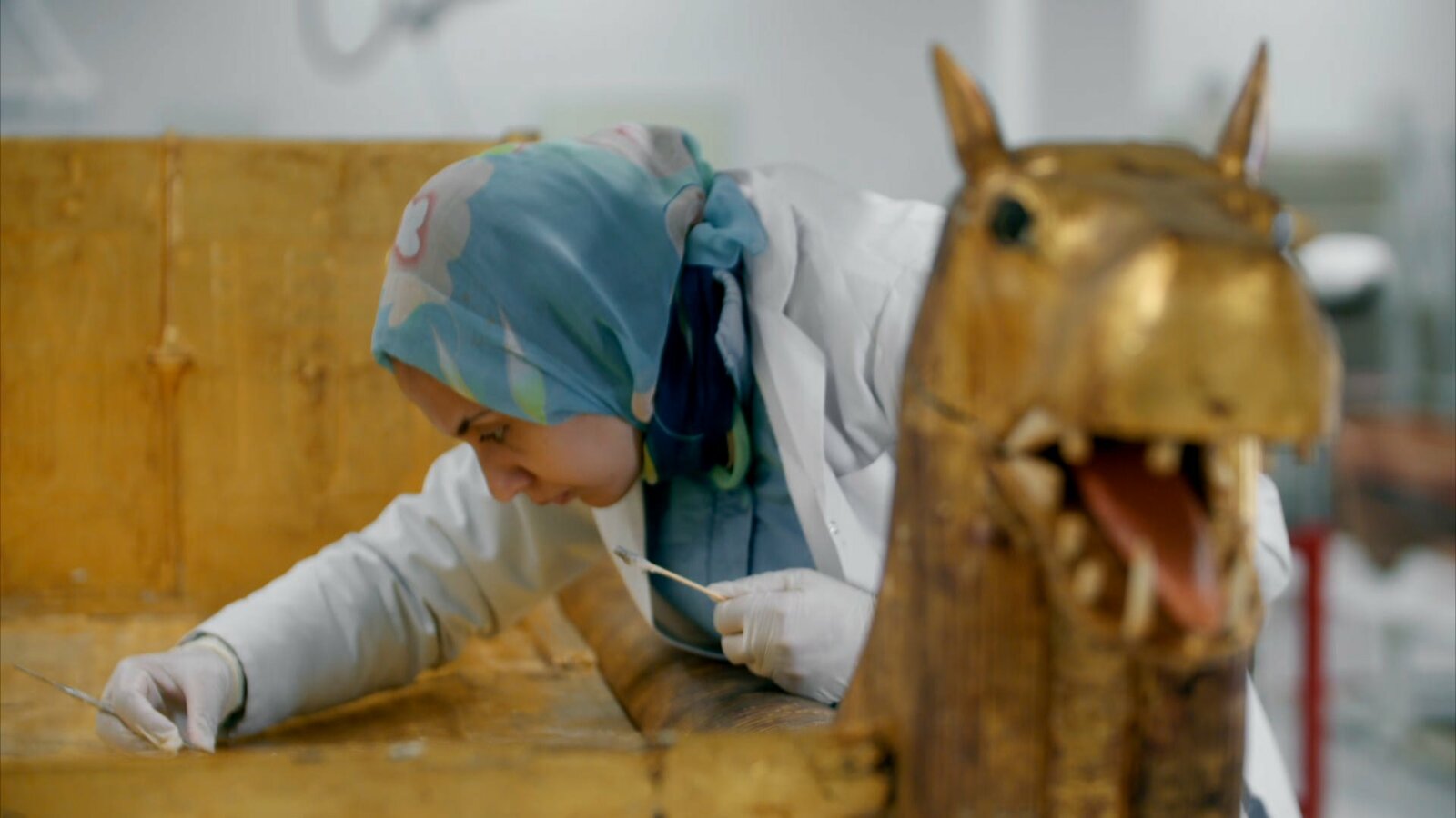 Die Geheimnisse TutanchamunsCairo, Egypt - A member of the conservation team at the Grand Egyptian Museum works on restoring Tutankhamun's treasures.Bild: © Windfall Films