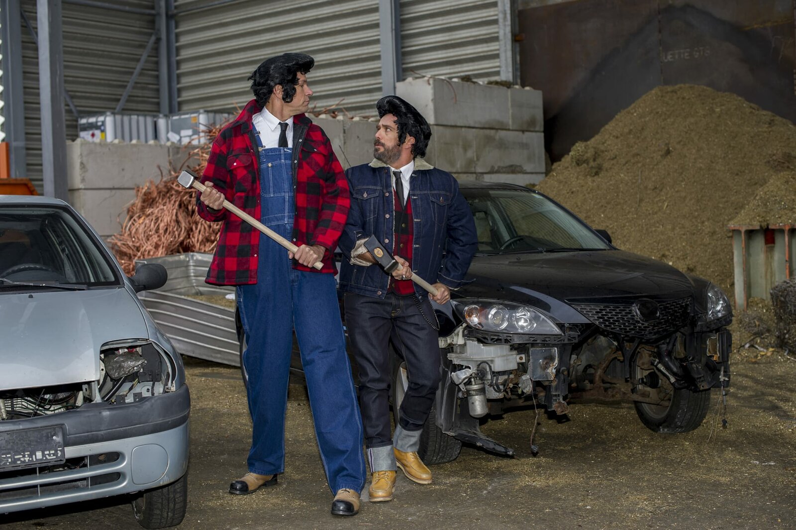 Auf dem SchrottplatzZwei Männer hämmern abwechselnd im Takt auf ein Autowrack ein.ÂBild: © KiKA/MingaMedia/Holger Kast