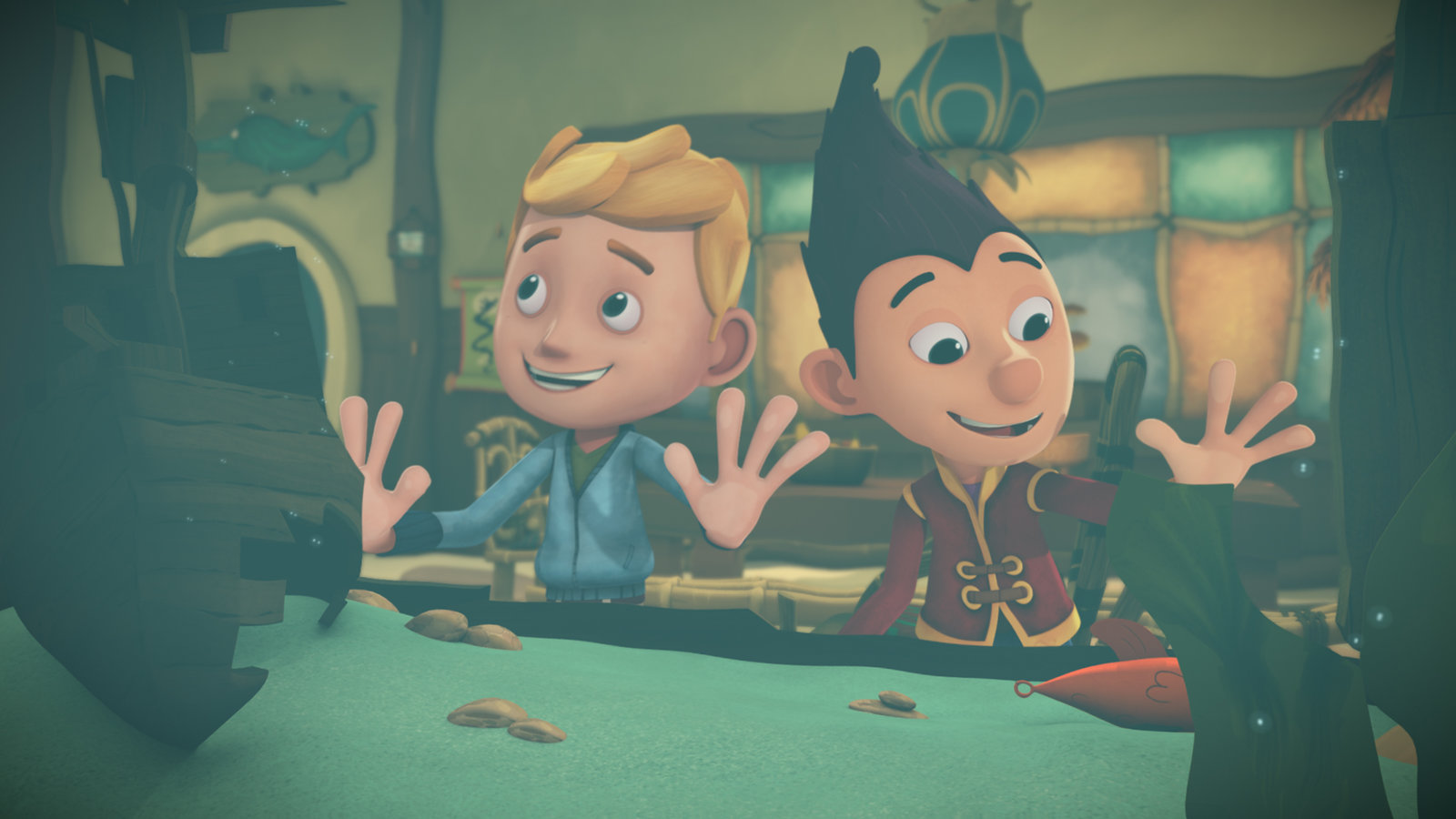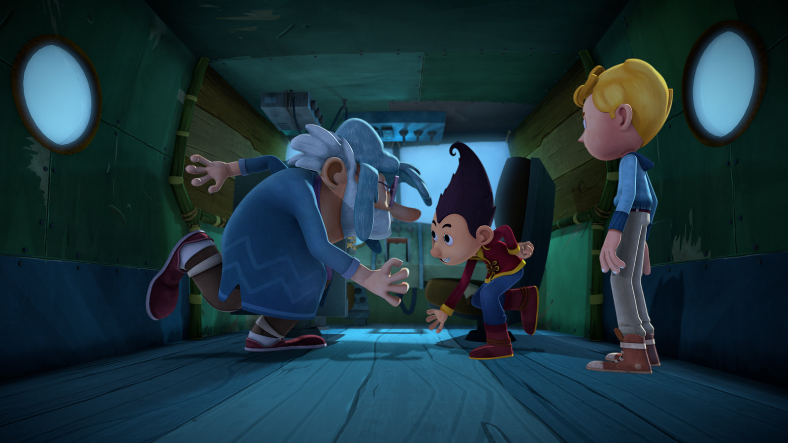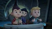 Seegras-Suppe & PiratenschätzeMit einem U-Boot gelangen Tashi, Lotus und Jack in das Innere des Piratenschiffs.Bild: © KiKA/Flying Bark Productions Pty Ltd.