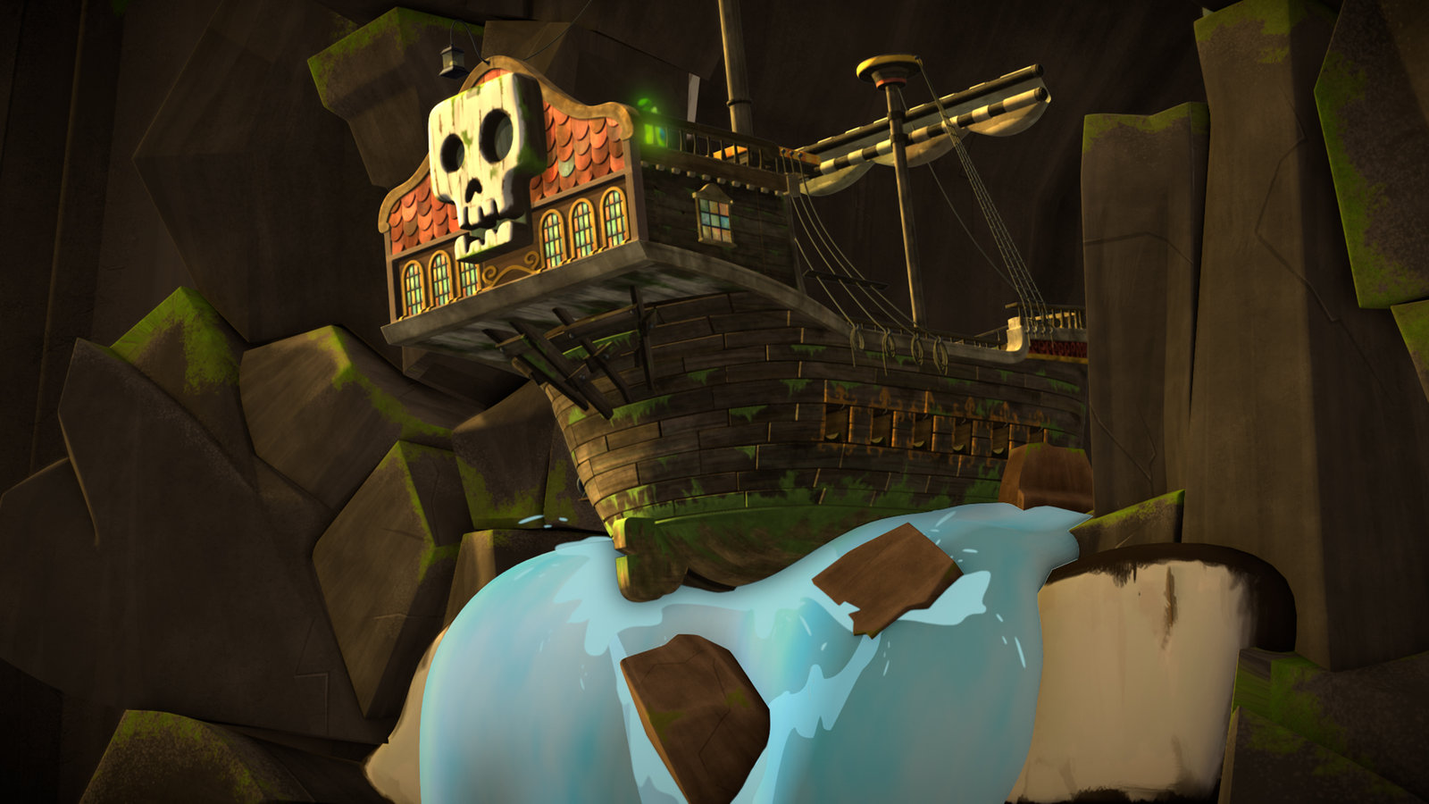 Geisterbahn & GeisterschiffDas Geisterschiff sitzt auf einem Wasserfall fest.Bild: © KiKA/Flying Bark Productions Pty Ltd.