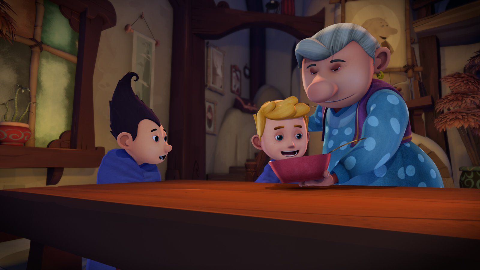Fremdweltlermaschine & AffenprinzessinDank Ömchen können sich Jack und Tashi wieder aufwärmen.Bild: © KiKA/Flying Bark Productions Pty Ltd.