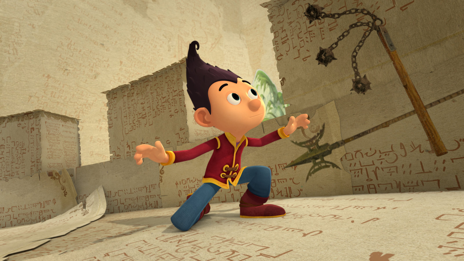 Phönixflug & FeuerfederTashi sucht im Buch der Sagen nach Werkzeugen, mit denen er sich wehren kann.Bild: © KiKA/Flying Bark Productions Pty Ltd.