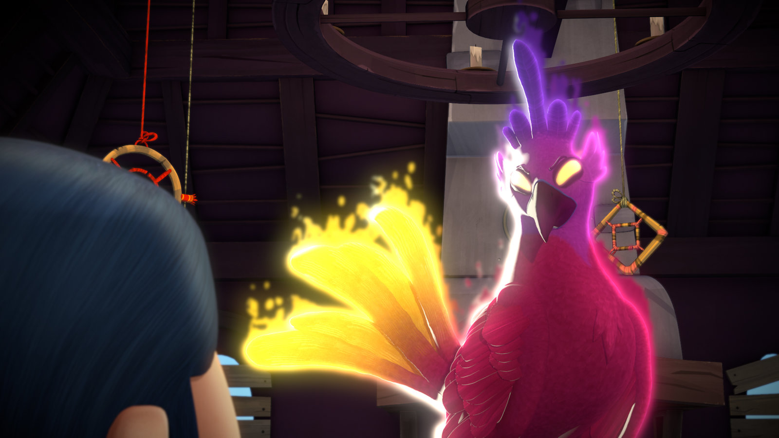 Phönixflug & FeuerfederLotus versucht den Phönix zu beruhigen.Bild: © KiKA/Flying Bark Productions Pty Ltd.