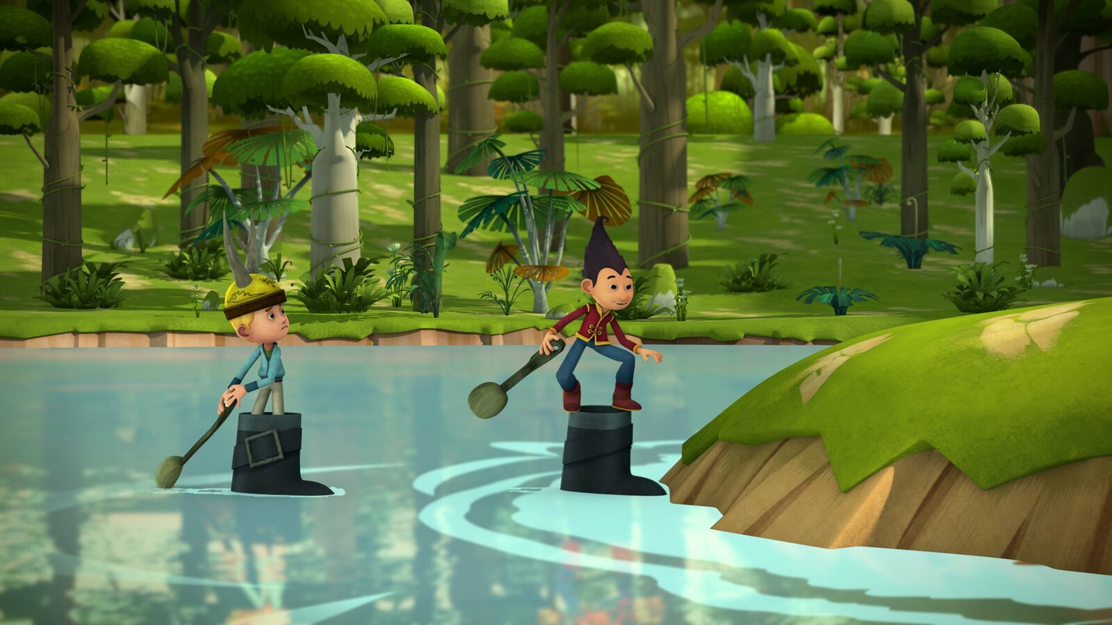 Ogerlympiade & GimpelbockhelmeJack und Tashi überqueren noch vor dem Oger den Fluss.Bild: © KiKA/Flying Bark Productions Pty Ltd.