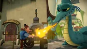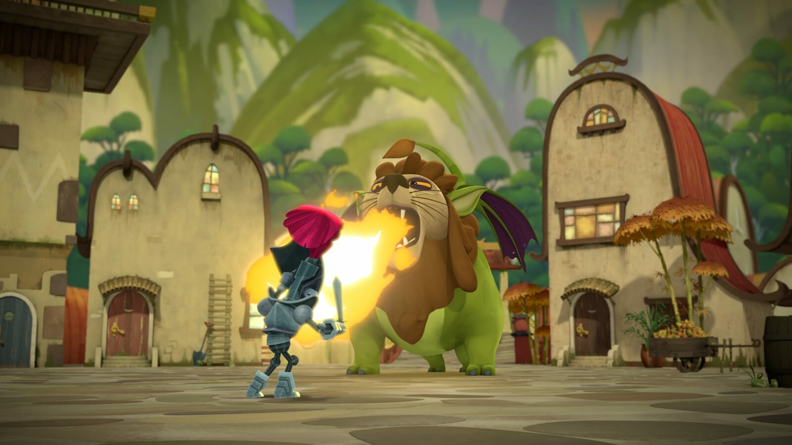Kicherbeeren & MampfhungerDer Drachenlöwe und Sir Schepperdi von Schreck sind aus dem Buch der Sagen ins Dorf gelangt.Bild: © KiKA/Flying Bark Productions Pty Ltd.
