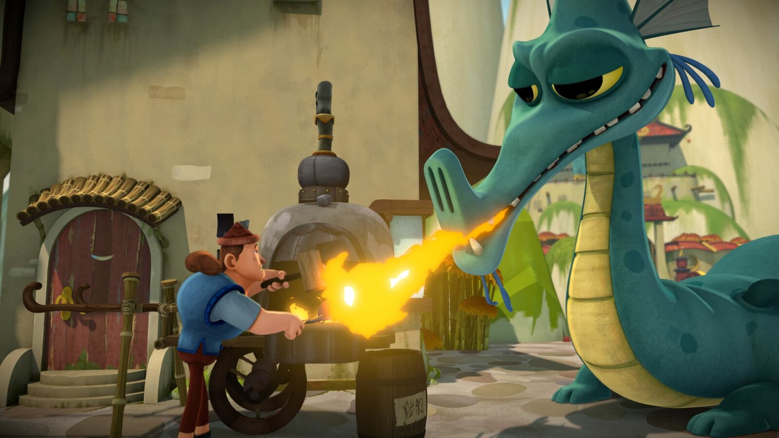 Tigervogel-Eier & FeuerkrautDer Feuerdrache hilft dem Schmied beim Pingo-Pango-Schläger schlagen.Bild: © KiKA/Flying Bark Productions Pty Ltd.