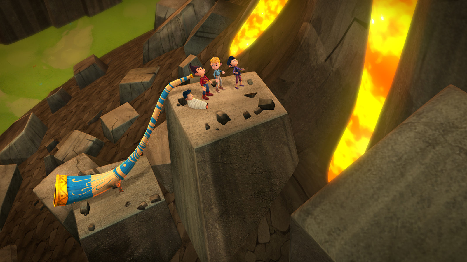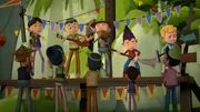 Heuschreck-Schmetterlinge & Alphorn-LaserDas Alphorn hat einen Vulkanausbruch verursacht.Bild: © KiKA/Flying Bark Productions Pty Ltd.