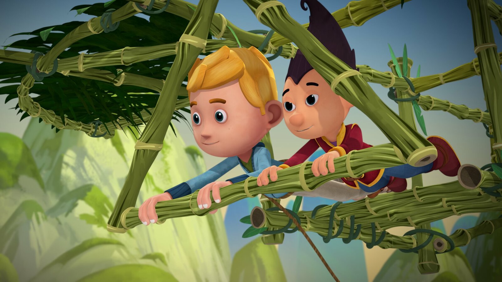 Tashi & JackJack und Tashi fliegen gemeinsam zum Dorf.Bild: © KiKA/Flying Bark Productions Pty Ltd.