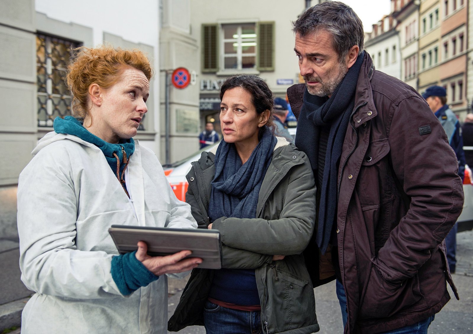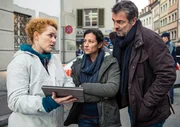 Ihr werdet gerichtetLiz Ritschard (Delia Mayer, M.) und Reto Flückiger (Stefan Gubser, r.) mit der neuen kriminaltechnischen Leiterin Corinna Haas (Fabienne Hadorn, li.) am TatortBild: © ARD Degeto/SRF/Daniel Winkler