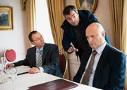 VerfolgtReto Flückiger (Stefan Gubser, Mitte) holt den zwielichtigen Bankdirektor Sonderer (Pierre Siegenthaler, re.) aus einer Vorstandssitzung.Bild: © HR/SRF/Daniel Winkler