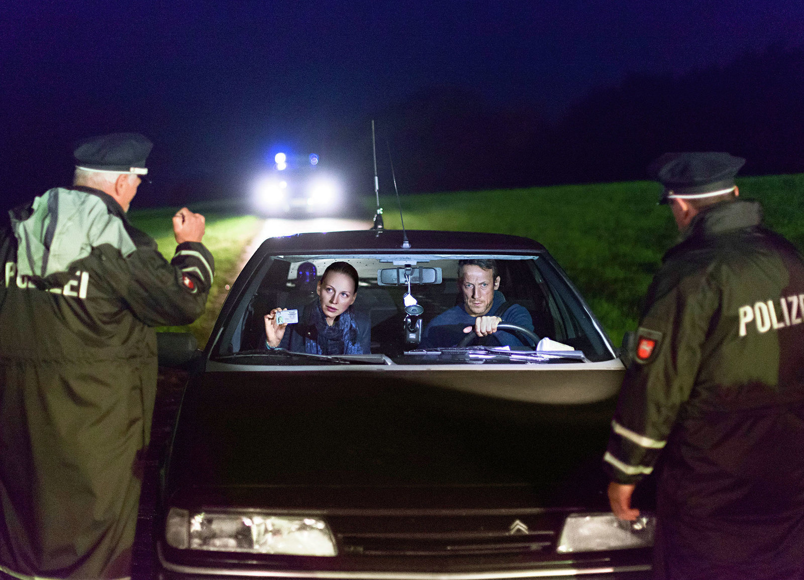 KaltstartAuf dem Weg zum Tatort: Wotan Wilke Möhring als Kommissar Falke, Petra Schmidt-Schaller als Kommissarin LorenzBild: © SRF/NDR/Boris Laewen