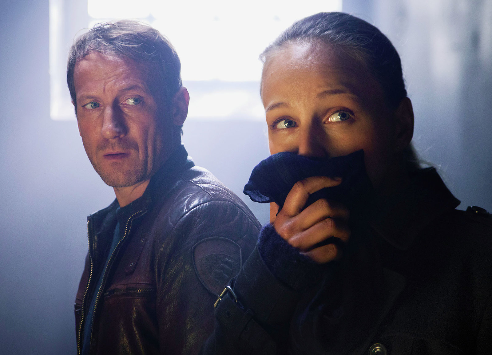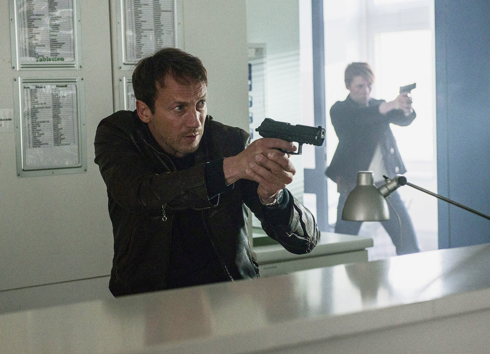Zorn GottesHaben die Geiselnehmer im Visier: Wotan Wilke Möhring als Falke, Franziska Weisz als Bundespolizistin Julia GroszBild: © SRF/NDR/Marion von der Mehden