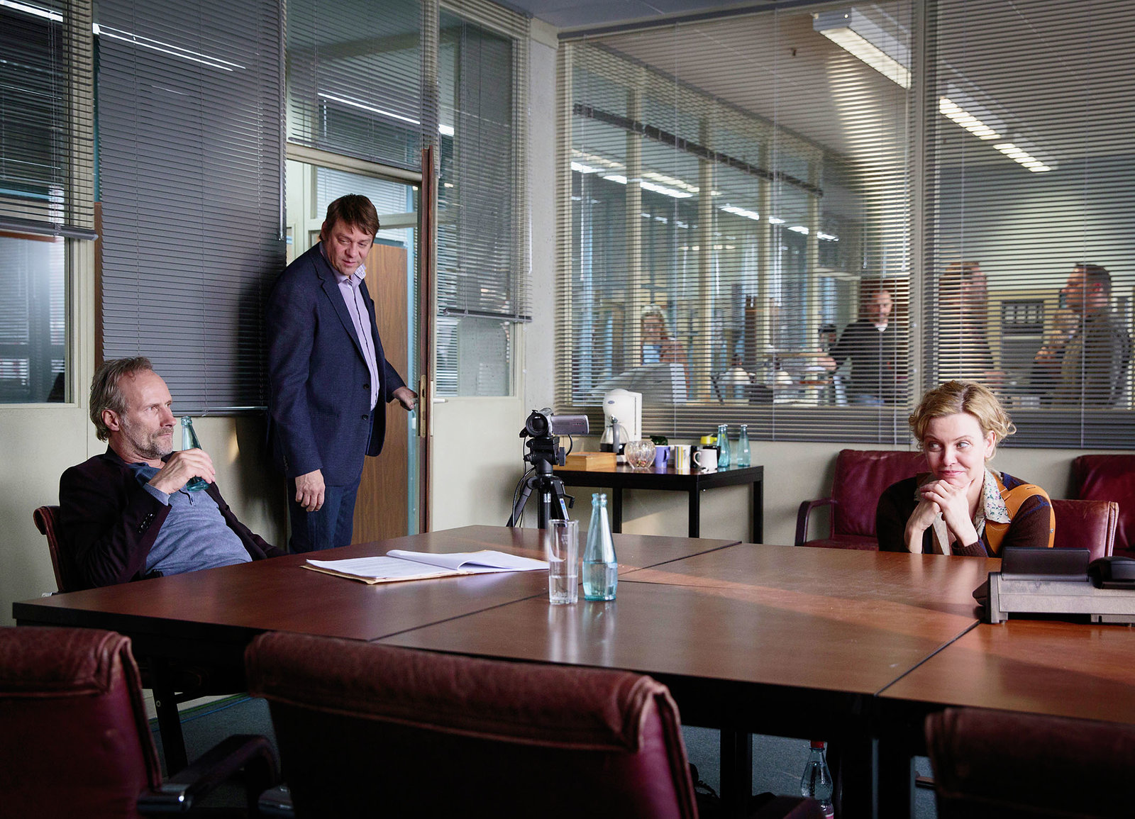 Niedere InstinkteBefragen die Nachbaer: Simone Thomalla als Kommissarin Eva Saalfeld, Susanne Wolff, als Vivien Prickel, Martin Wuttke als Kommissar Andreas KepplerBild: © SRF/MDR/Saxonia Media/Junghans