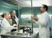 Erkläre ChimäreWettstreit, wer dem Kommissar die Ergebnis der Untersuchung präsentiert: Christine Urspruch als Silke Haller, Axel Prahl als Frank Thiel, Jan Josef Liefers als Prof. Karl-Friedrich BoerneBild: © SRF/WSR/Martin Valentin Menke