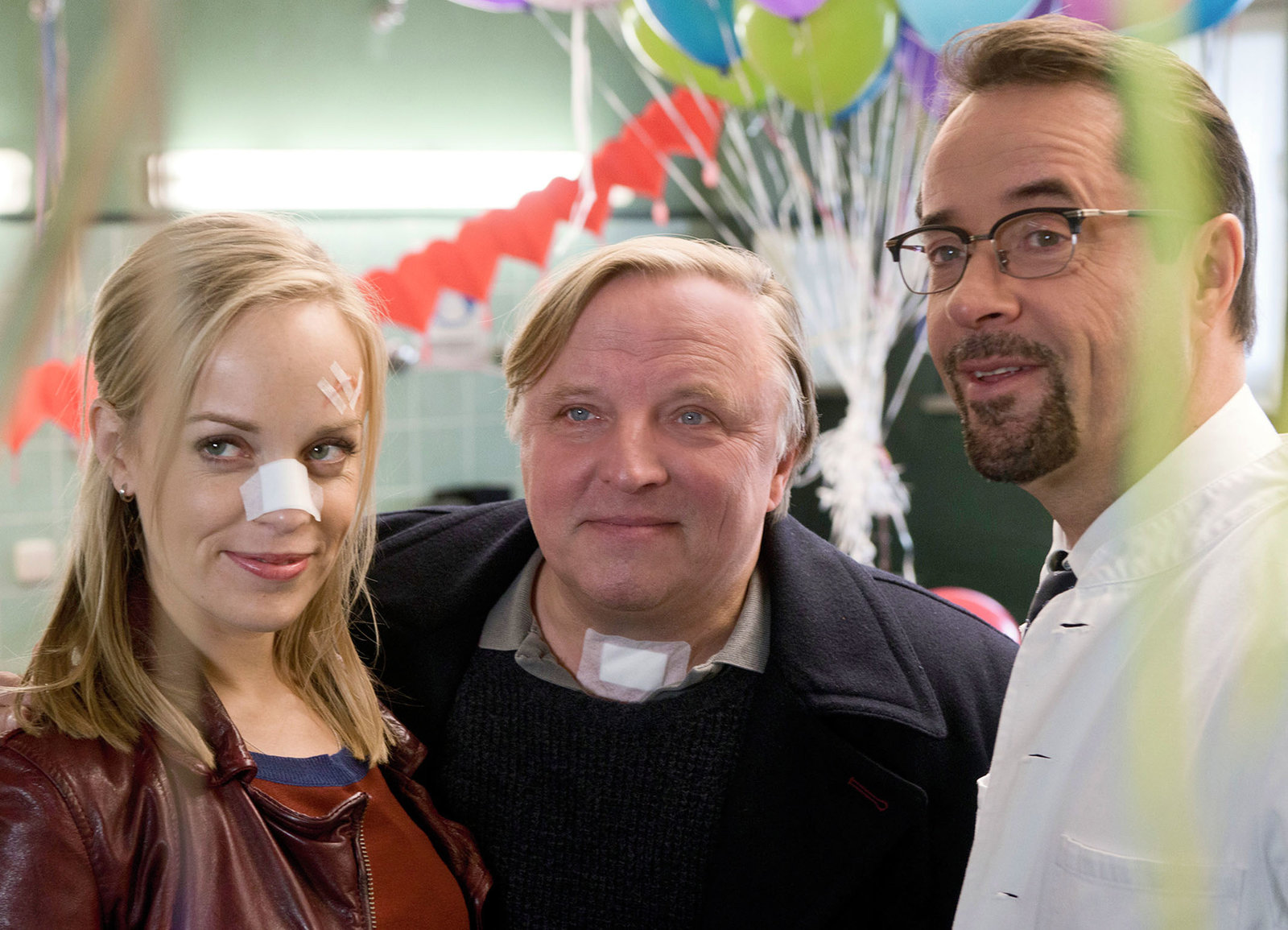 SchwerelosAm Krankenbett des Schwerverletzten: Jörg Hartmann als Kriminalhauptkommissar Peter Faber, Aylin Tezel als Oberkommissarin Nora Dalay, Anna Schudt als Hauptkommissarin Martina BönischBild: © SRF/WDR/Thomas Kost